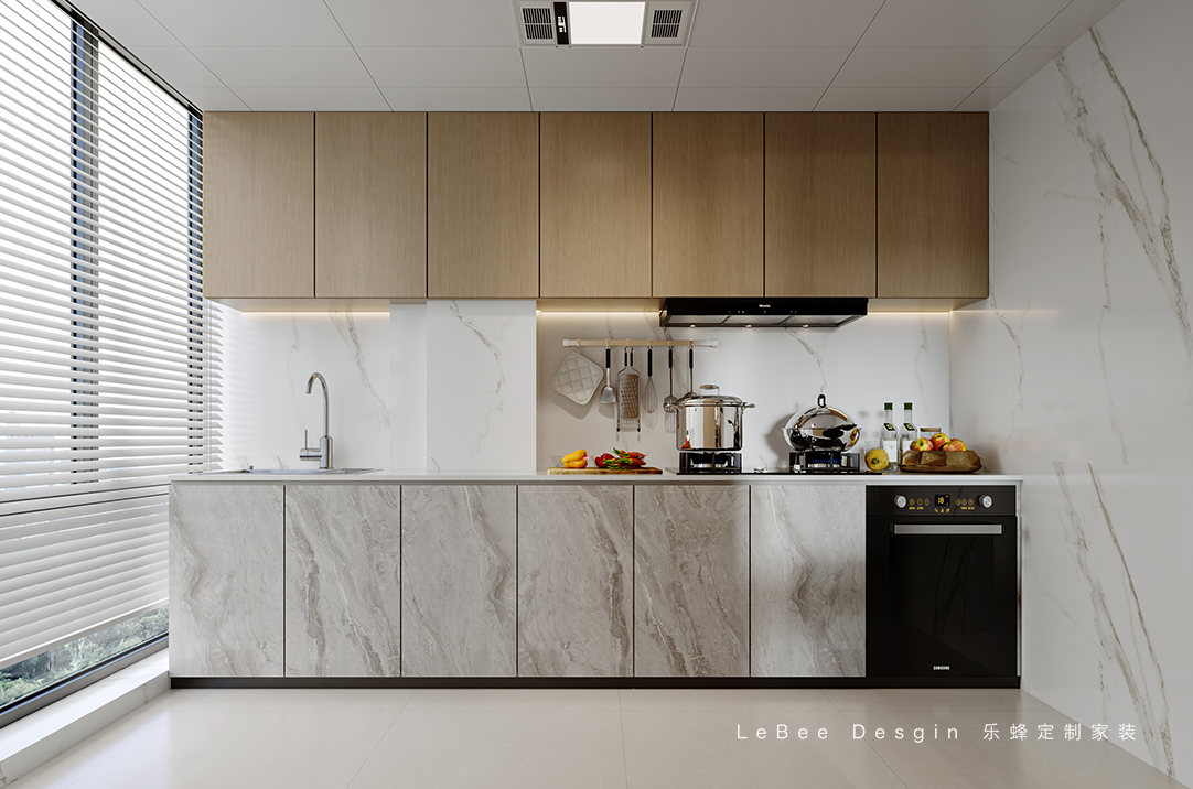 廚房采用隱藏推拉門設計,解決油煙擴逸困擾,為空間賦予變化,與核心區域相連。上下吊柜設計,簡約而時尚。操作臺上擺放著各種精致的廚具,讓人感受到生活的煙火氣。廚房的墻面采用了灰色的瓷磚,耐臟易清潔。