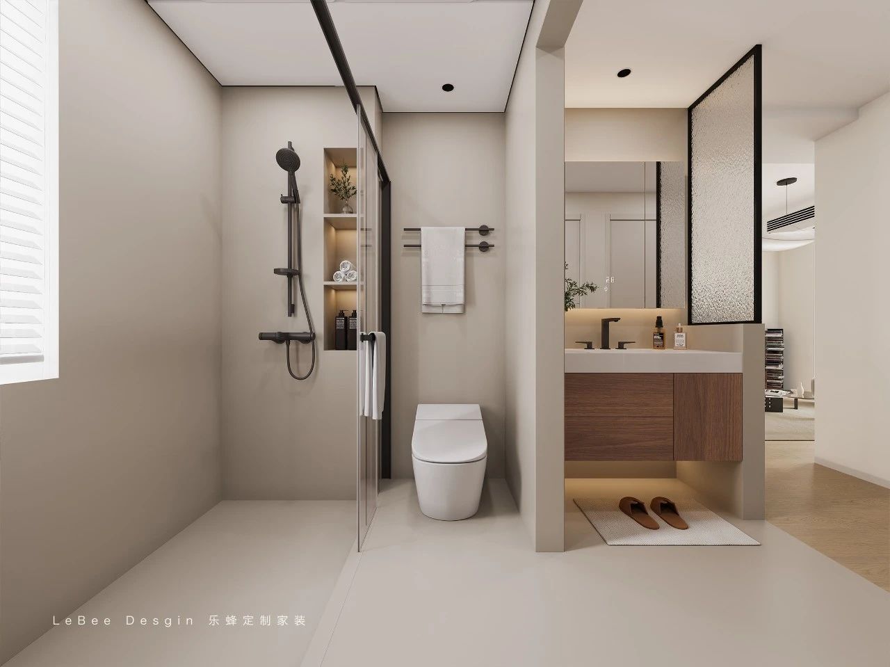 衛生間采用洗手盆外置的設計,將洗漱區與淋浴區、馬桶區分開,實現了干濕分離,更加方便日常使用。