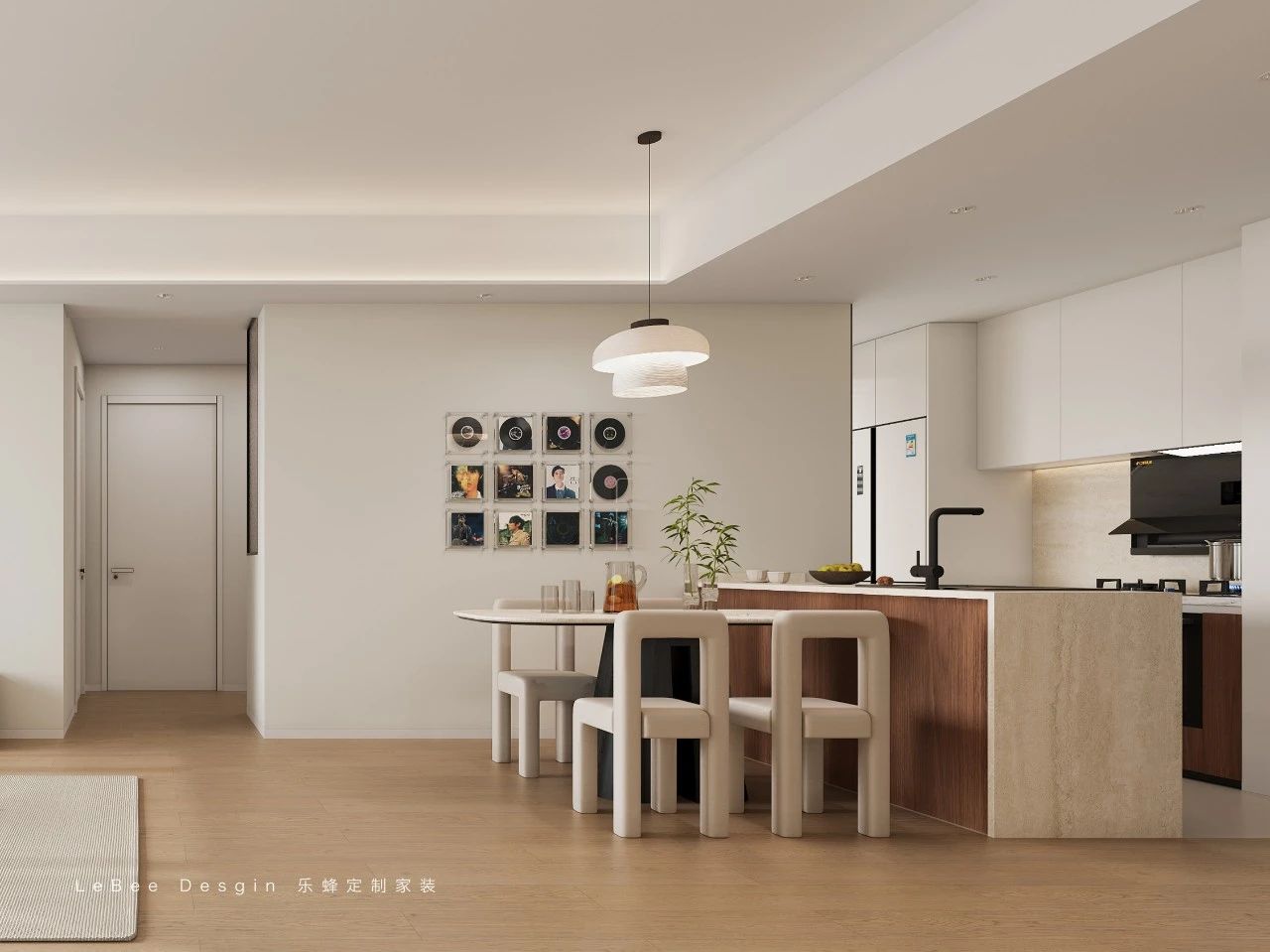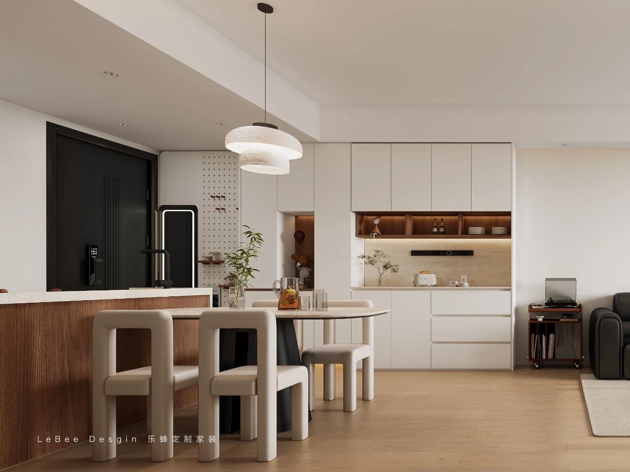 水吧臺的設計增加了操作臺面空間與收納空間,合理的行走動線讓用餐環節更加便捷。餐桌穿插在島臺中間,提升了空間的層次感。