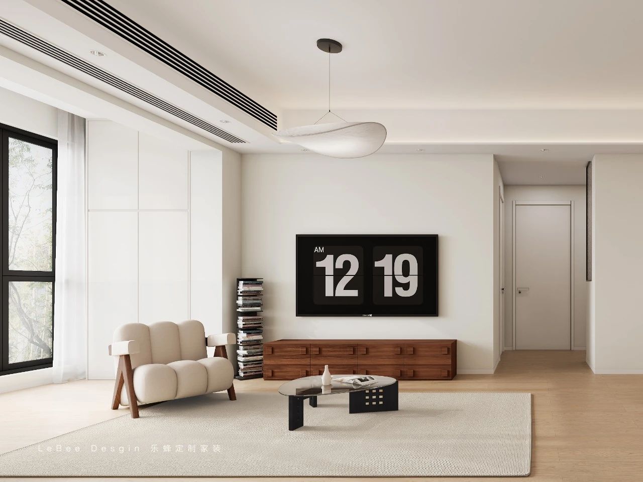 電視背景墻采用奶油白乳膠漆通刷,搭配復古的電視柜,簡約大氣。