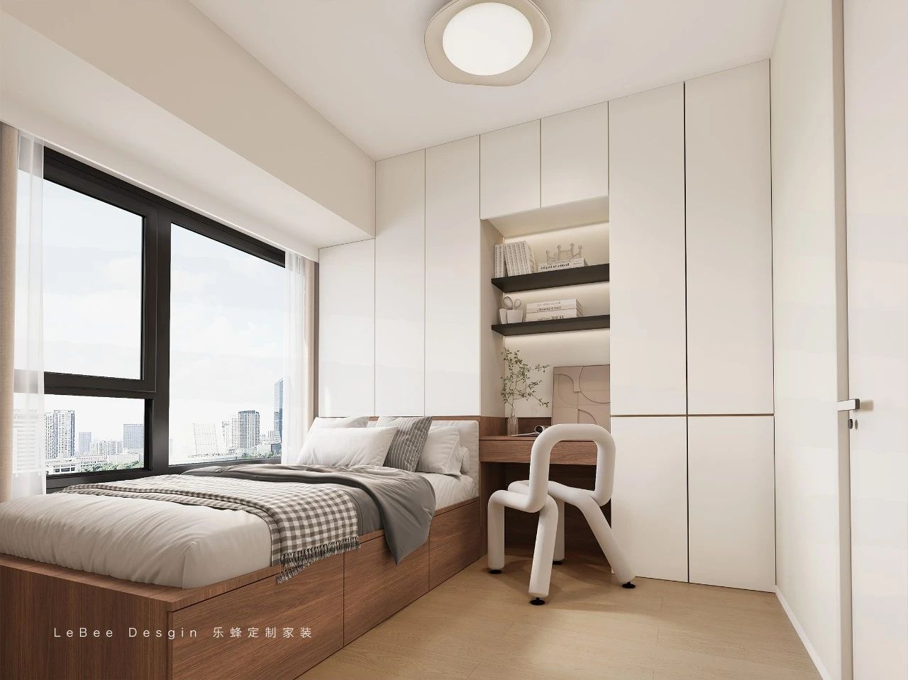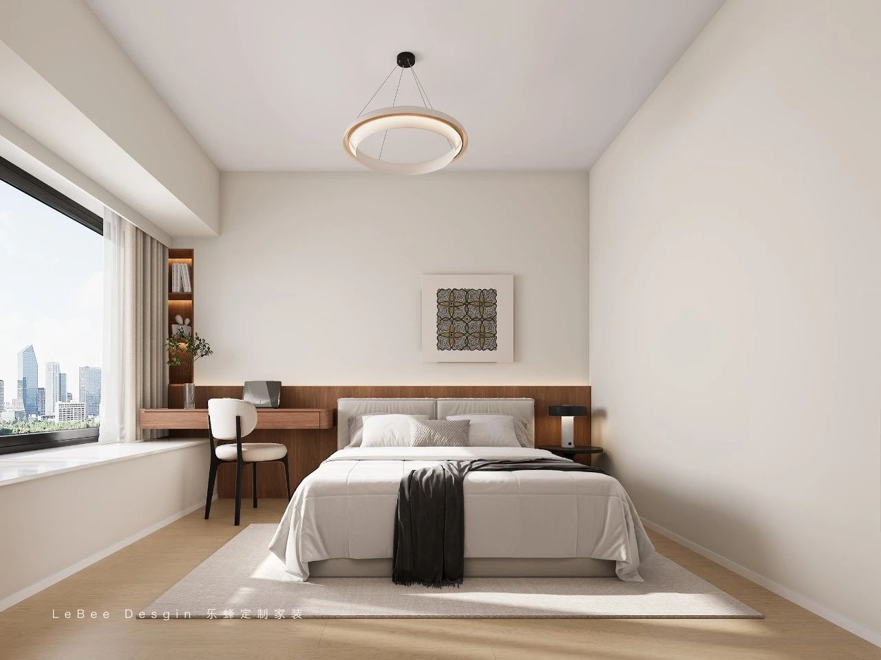 臥室整體以原木色和白色為主,胡桃木板墻木飾面點綴空間寬敞明亮。