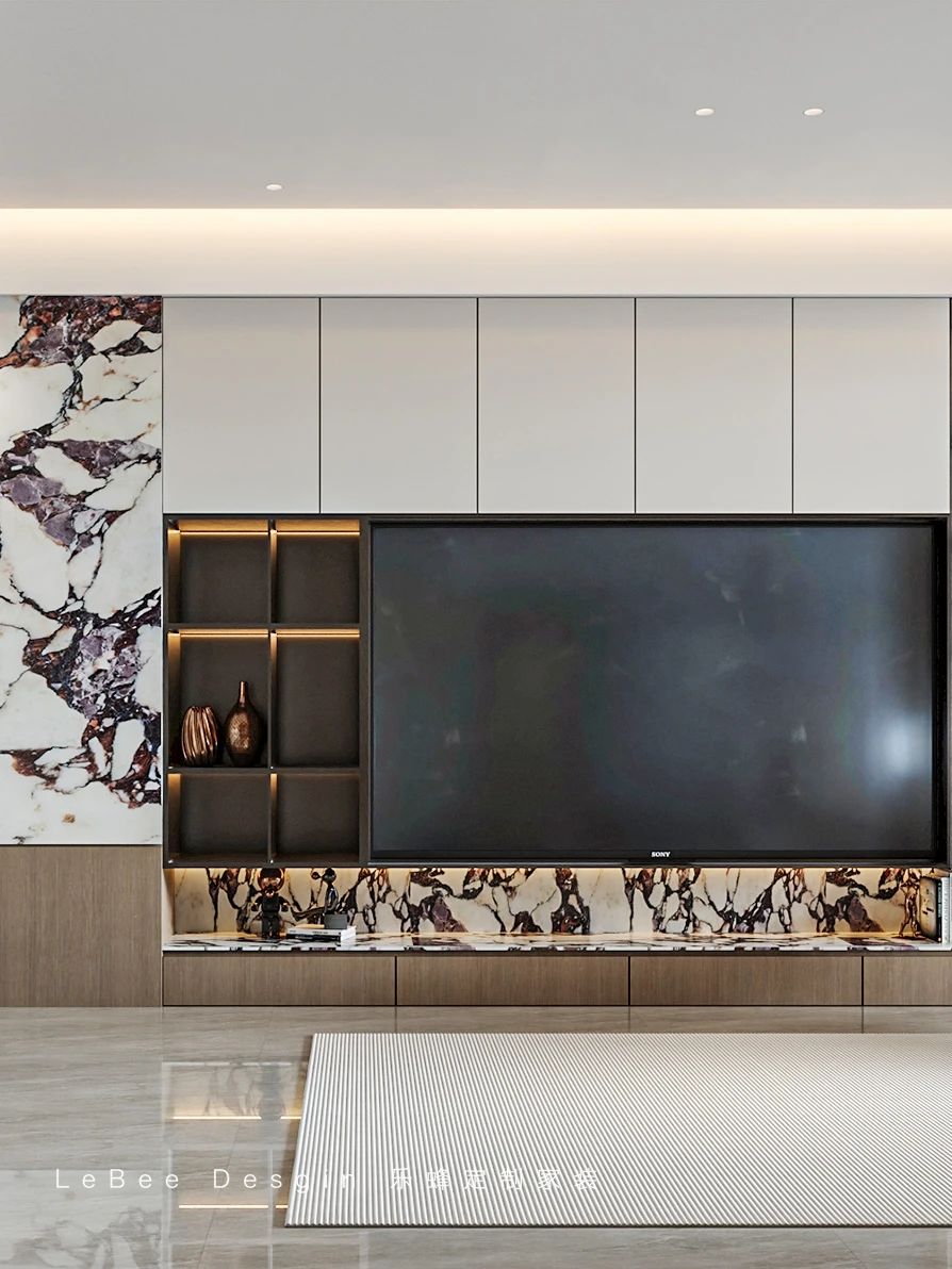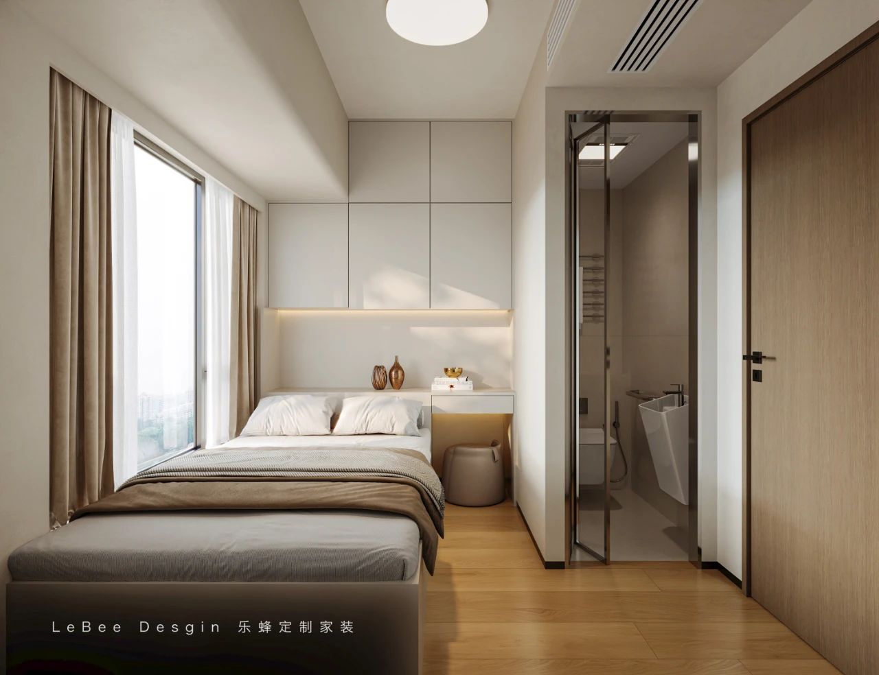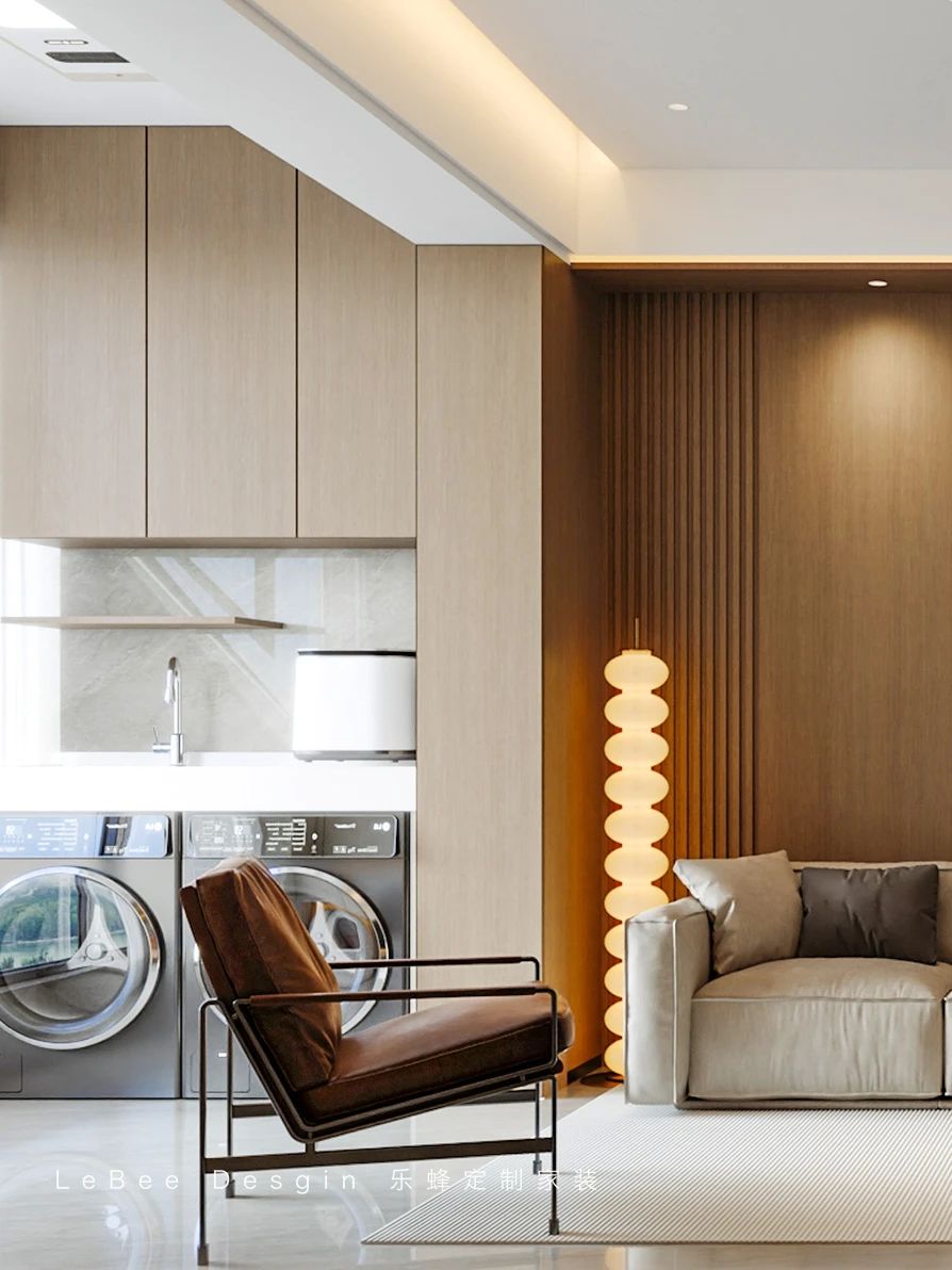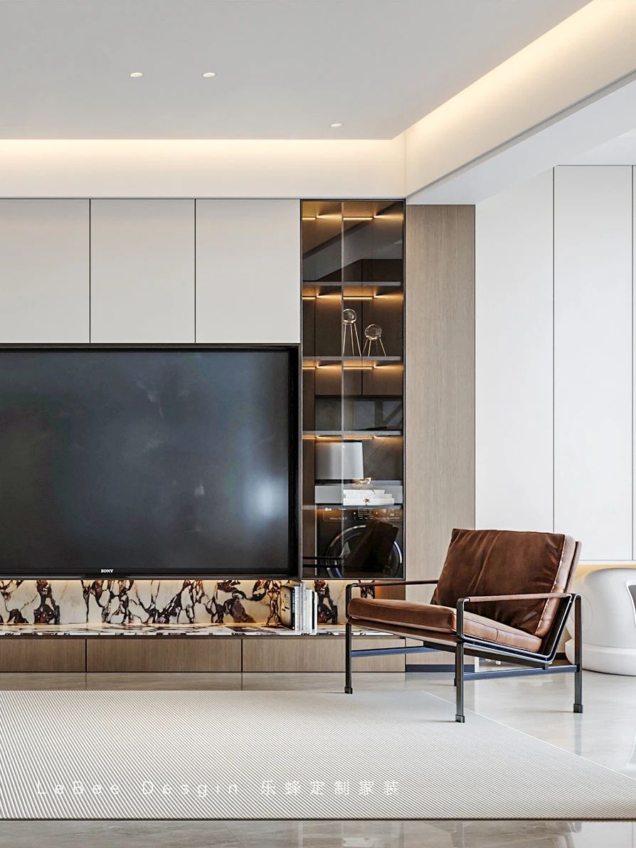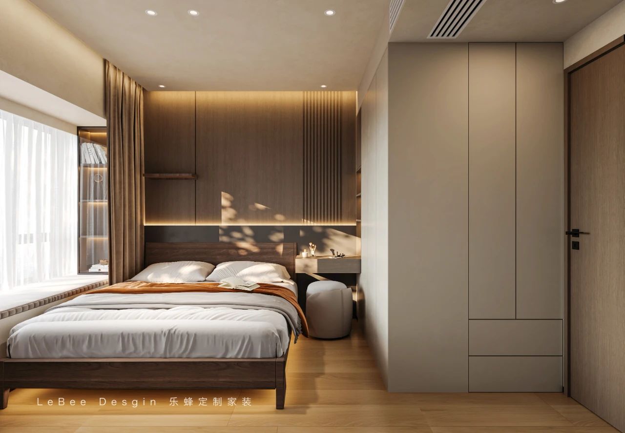 定制的衣柜采用無把手設計,線條流暢,與整體風格完美融合。在這個私人空間里,你可以盡情放松身心,享受寧靜的時光。