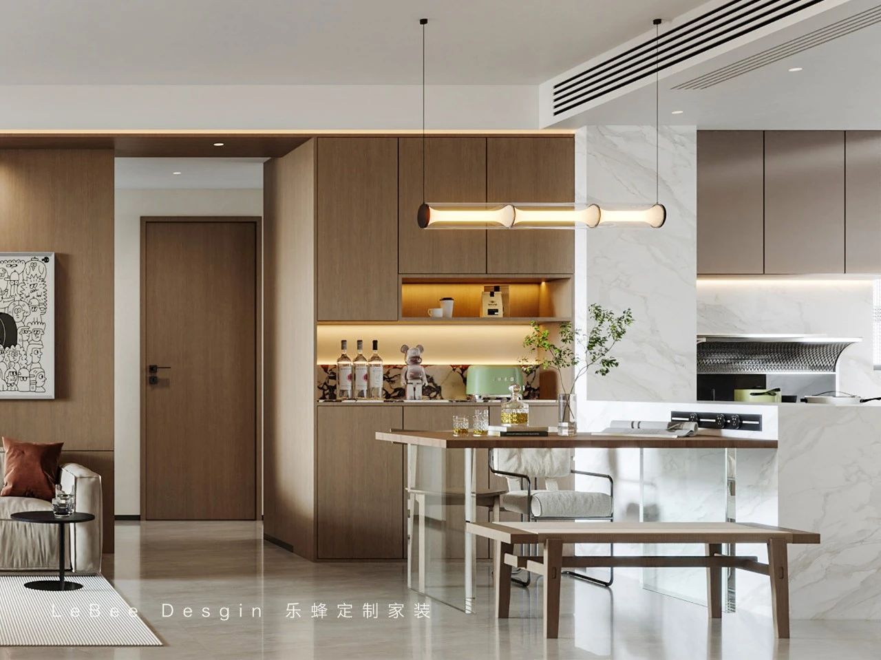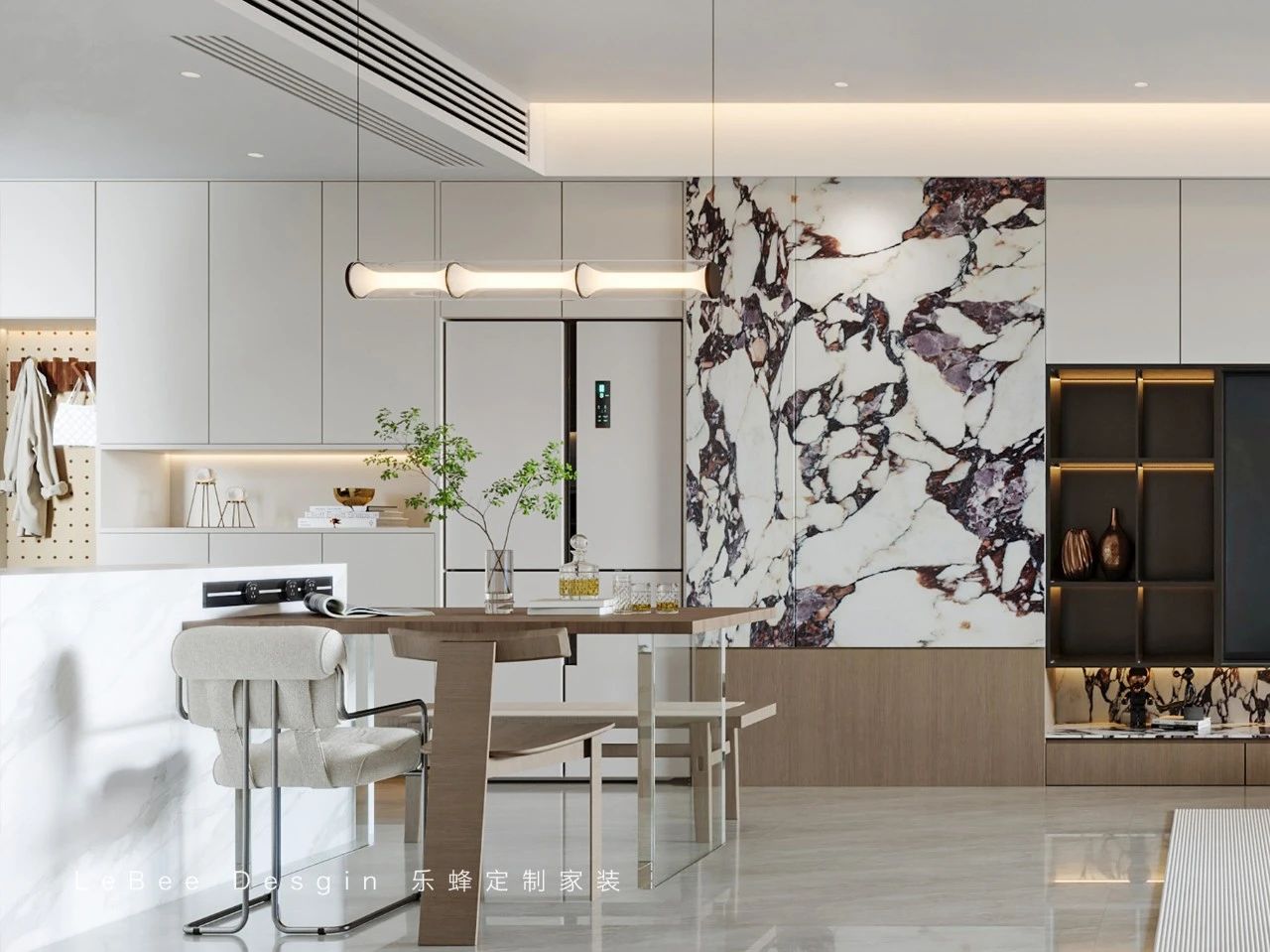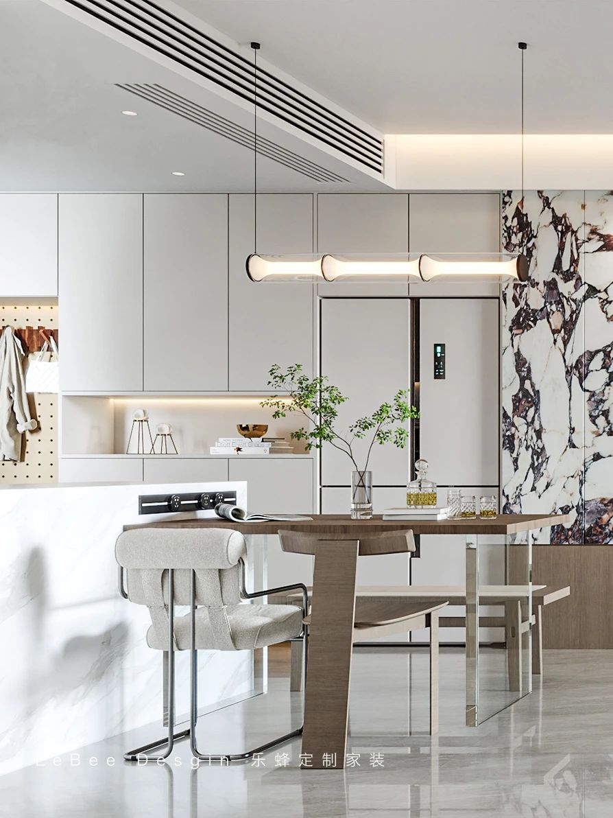 餐吧臺一體式設計,滿足了一家人的日常需求。整體空間以經典的白作為配色,極簡的餐廚空間搭配有機造型的家居,營造出一種時尚、現代的氛圍。