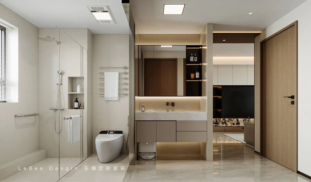 采用洗手盆外置,干濕分離的設計,避免了潮濕和滑倒的風險。可以在墻上安裝一些簡約的置物架,方便放置洗漱用品。公衛雖然是公共空間,但也能給人一種舒適的感覺。