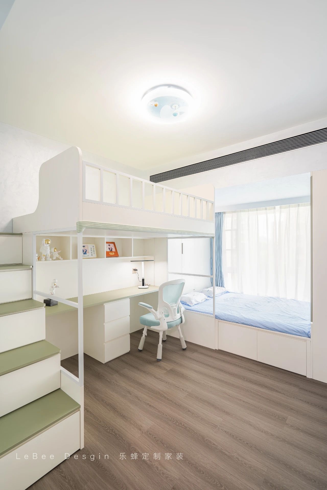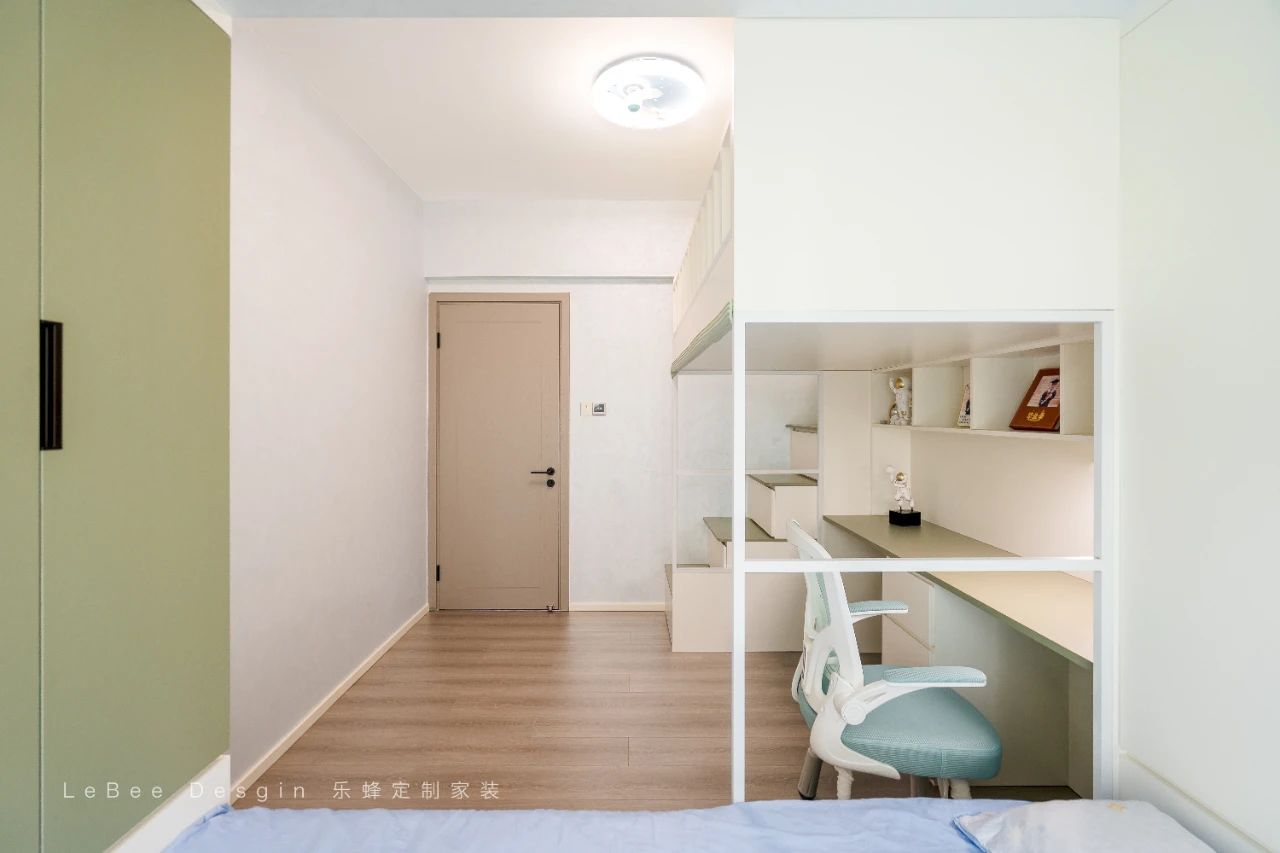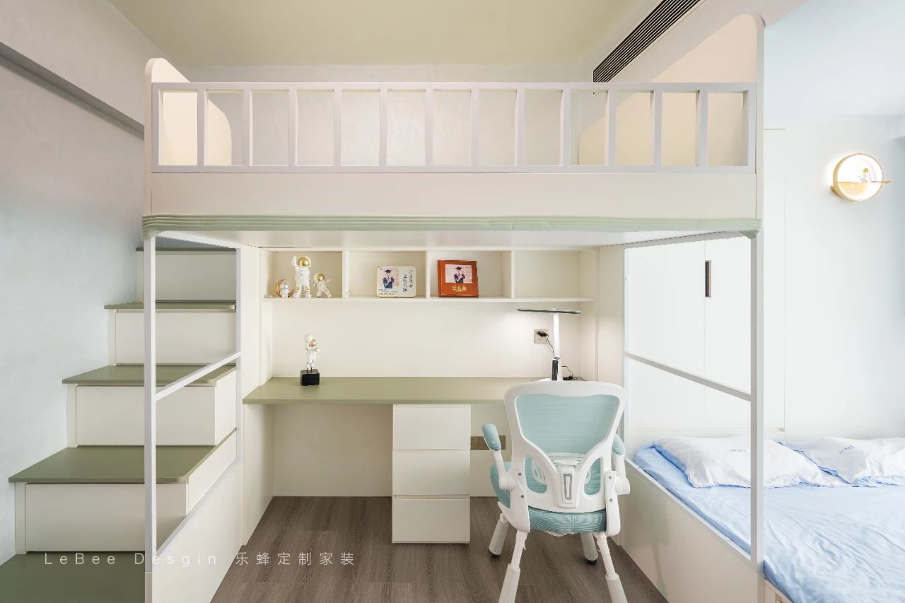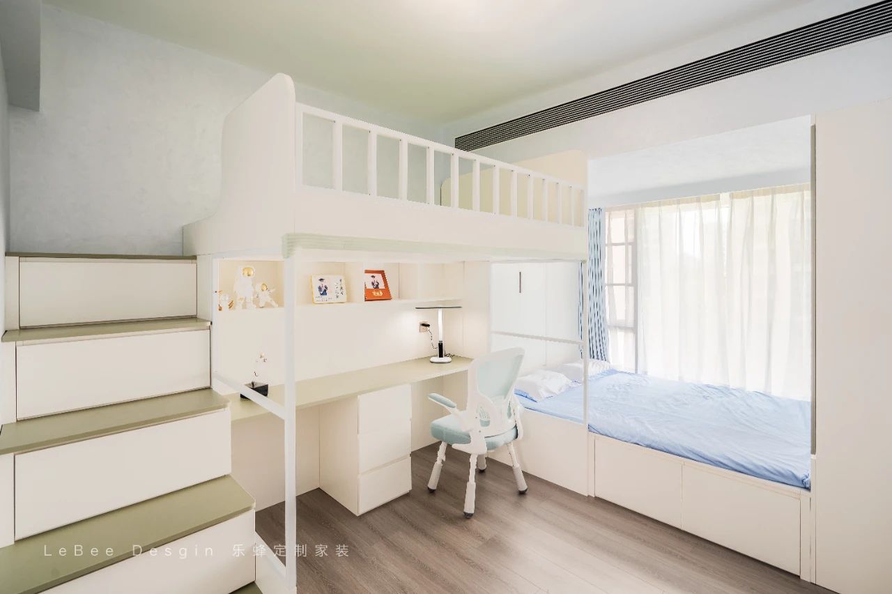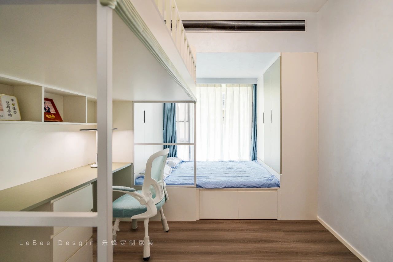 下床則定制書桌利用飄窗空間,定制榻榻米柜體,安置睡眠區,使整個空間實用性yyds!