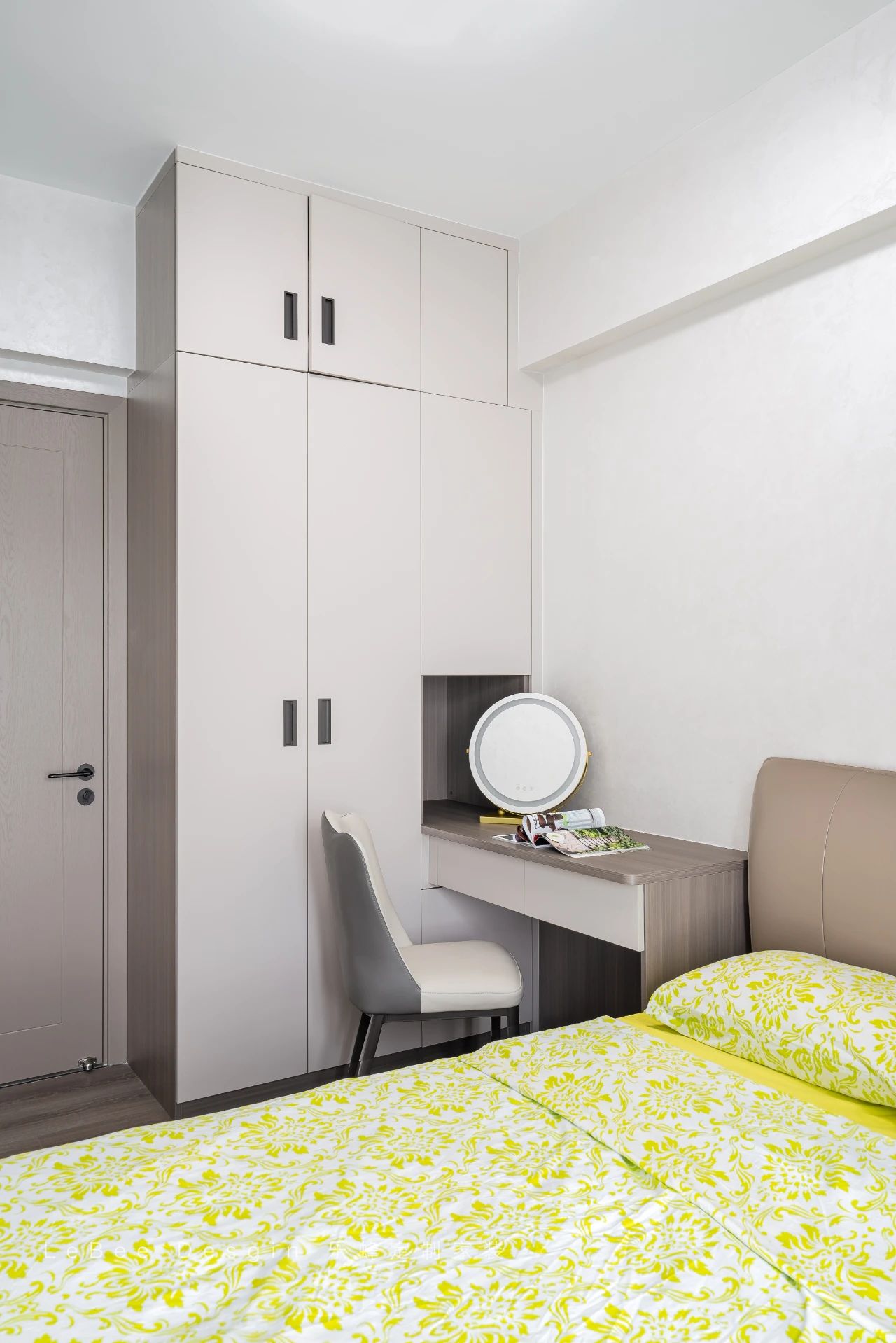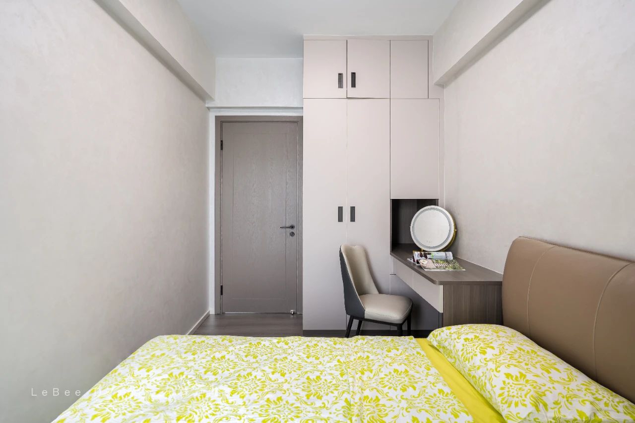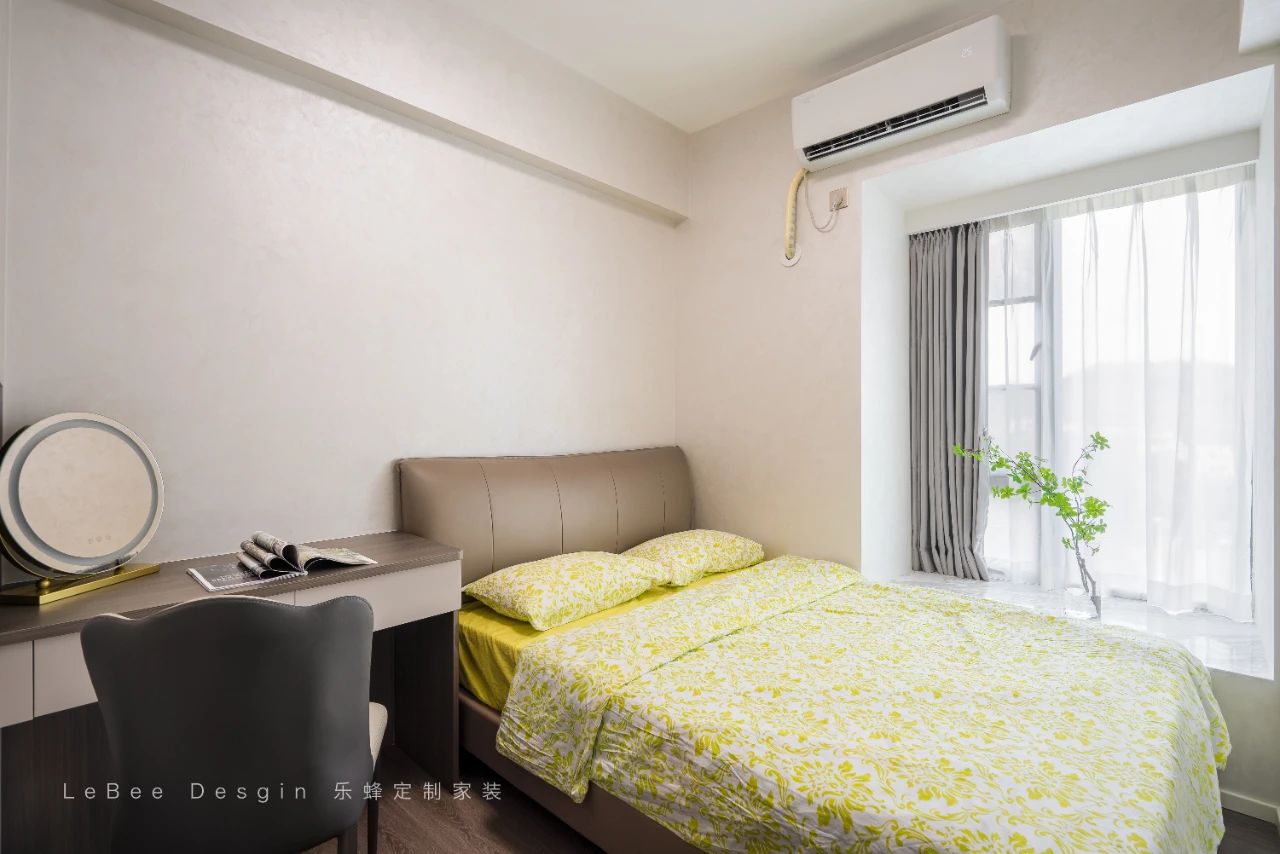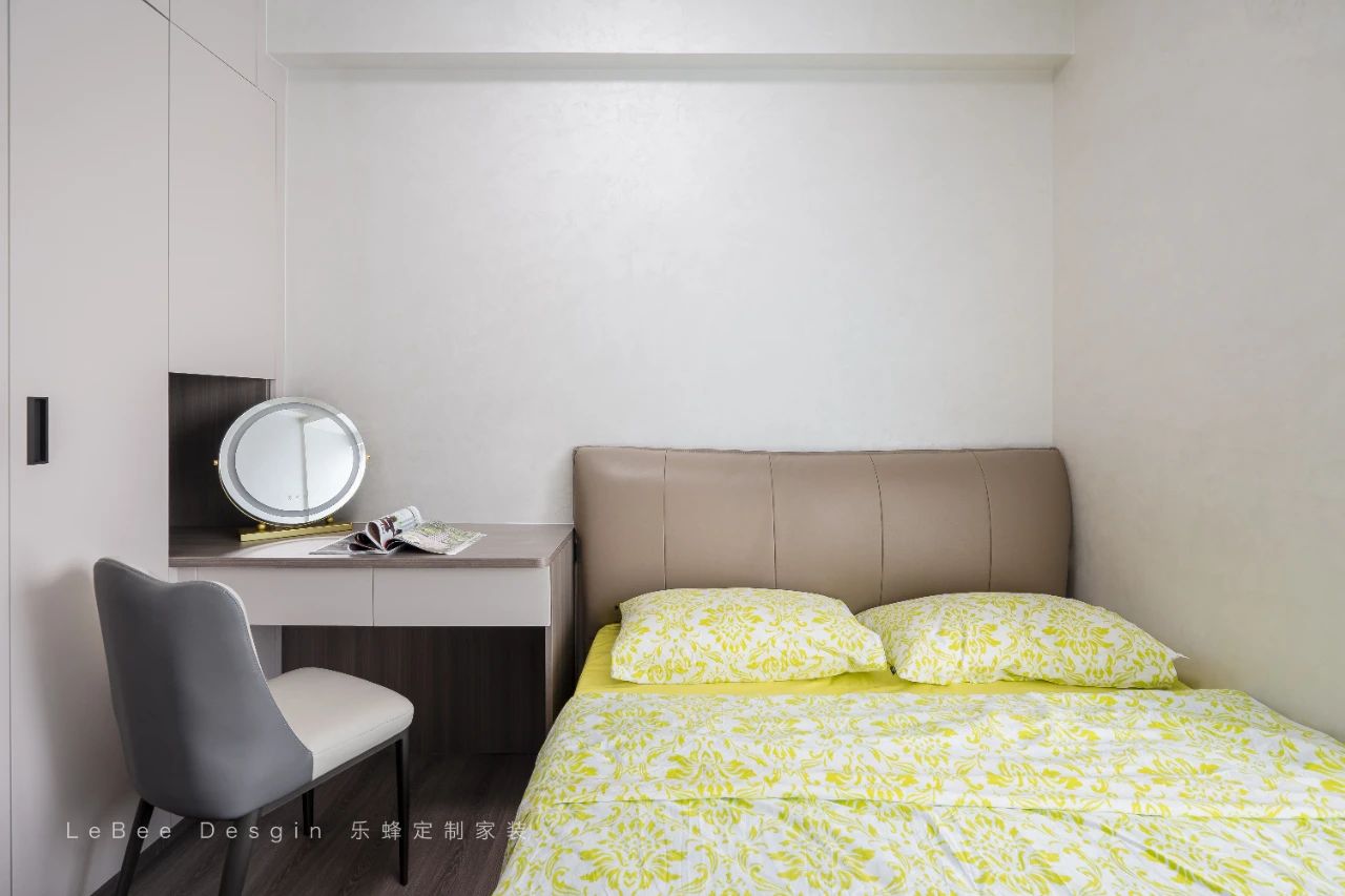 次臥則遵循實用型,定制柜體延伸梳妝臺放置成品床。