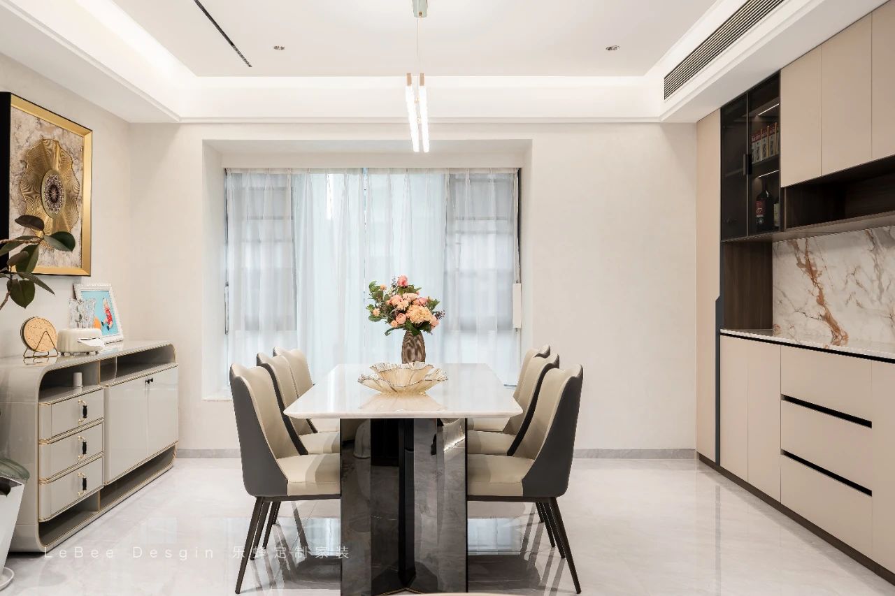巖板餐桌搭配皮質餐椅,簡約而不失舒適,色彩的和諧統一營造出極佳的視覺觀感。