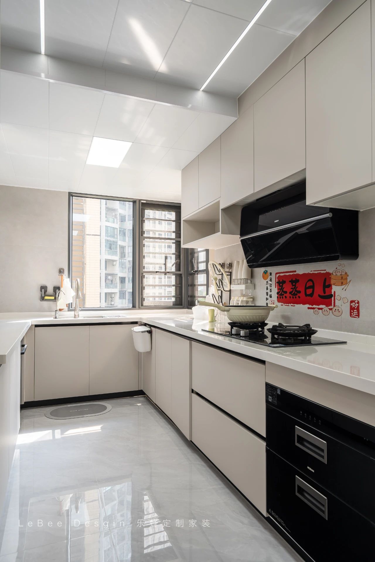 U 型廚房布局緊湊合理,白色櫥柜搭配隱形內嵌拉手,柔和的整體色調有效緩解了廚房的油煙氣息。精心規劃的動線設計,充分考慮到烹飪操作的便捷性,大大提高了廚房的使用效率,讓烹飪成為一種享受。