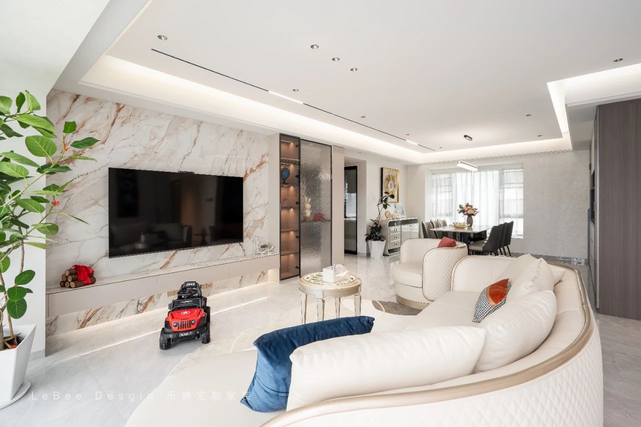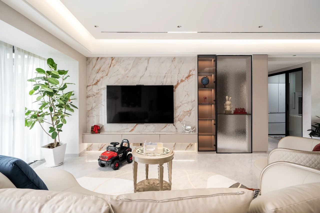 電視墻選用巖板輔以側邊的開放展示架,既彰顯了時尚現代的美學風格,又實現了收納功能的最大化。
