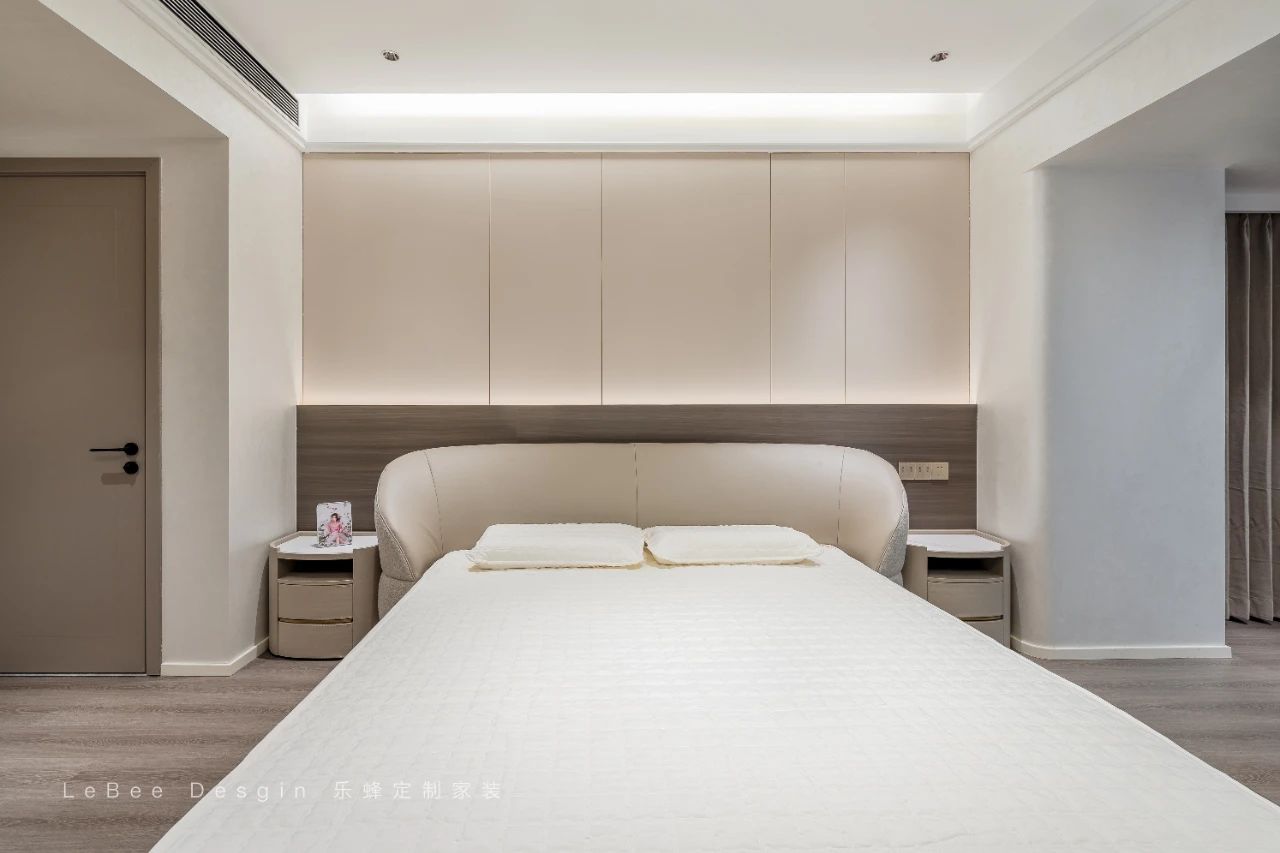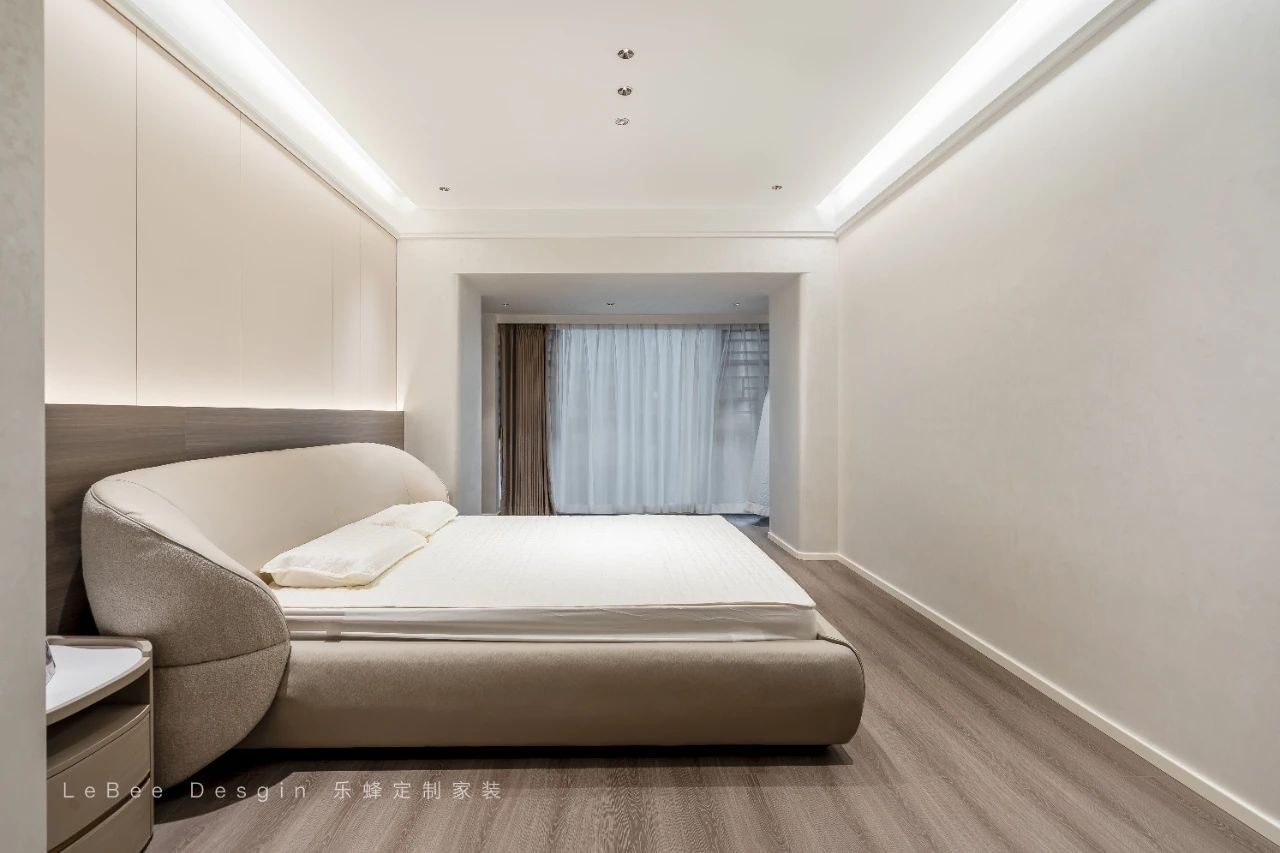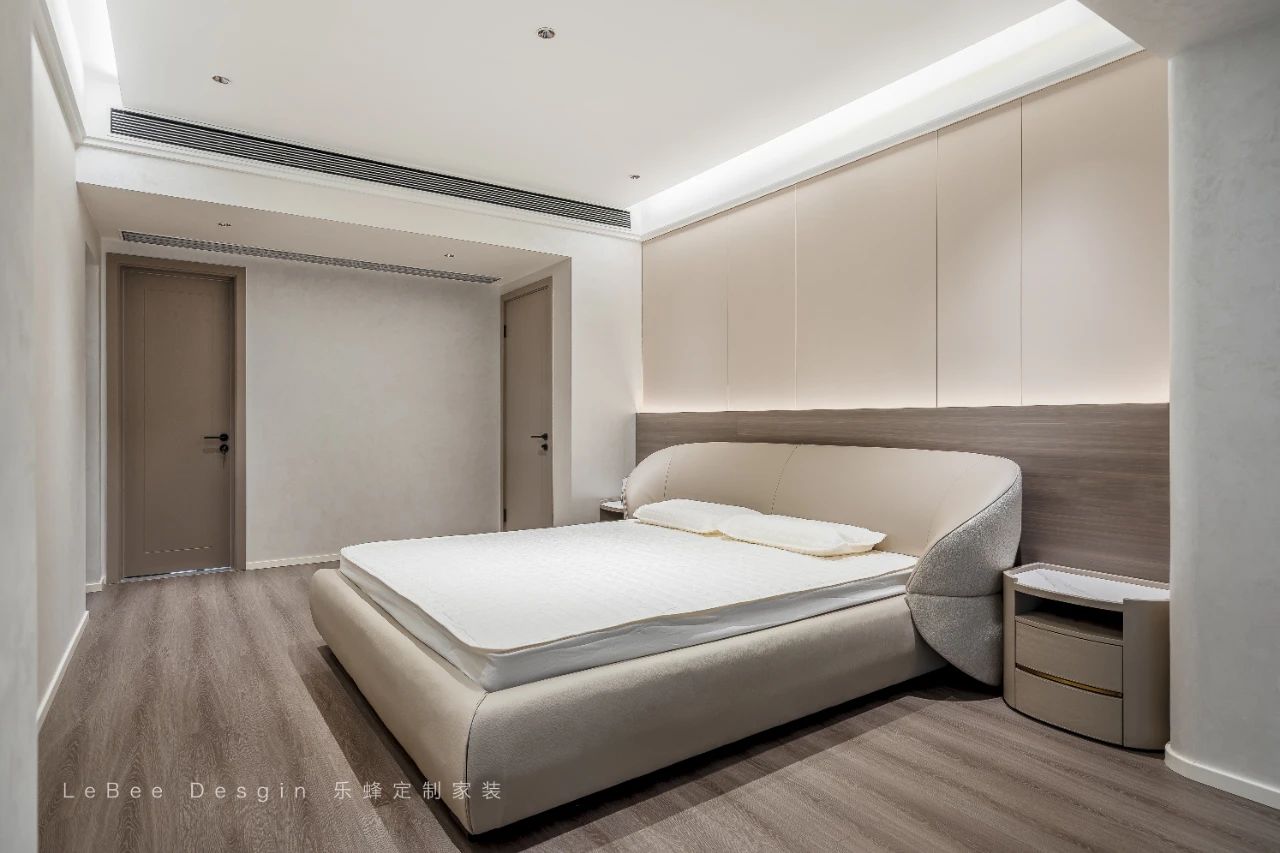 一方寧靜而溫馨的私密天地。木地板同色系+奶油色木飾面拼接+懸浮吊頂,仿佛懸浮在空中一般,充滿了現代感與設計感。底部的燈帶散發著柔和的光芒,不僅為臥室增添了一份浪漫的氛圍,更在視覺上賦予了整個空間輕盈靈動的感覺。