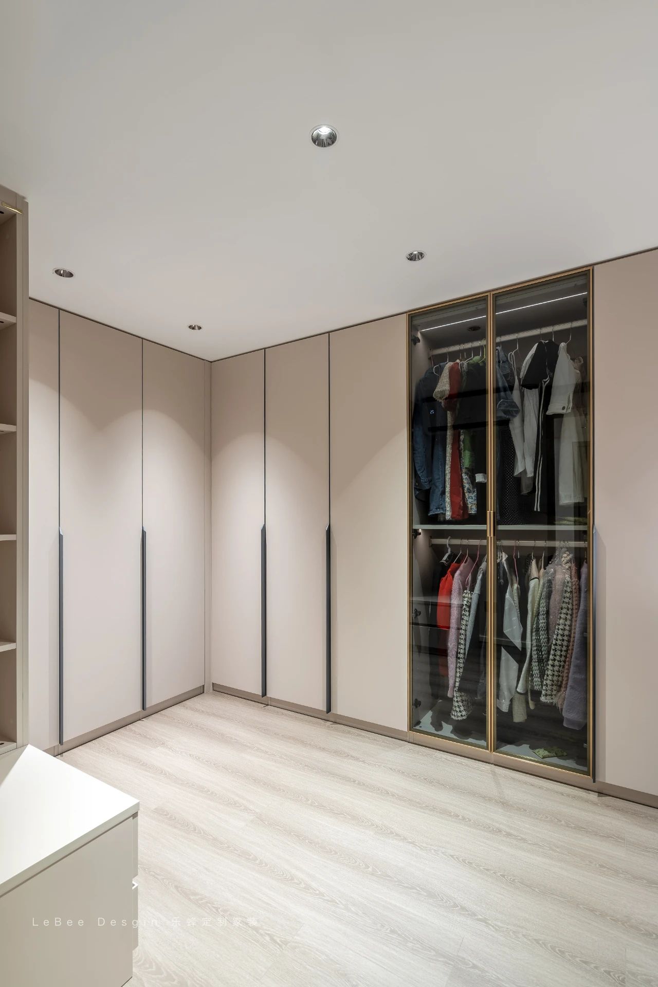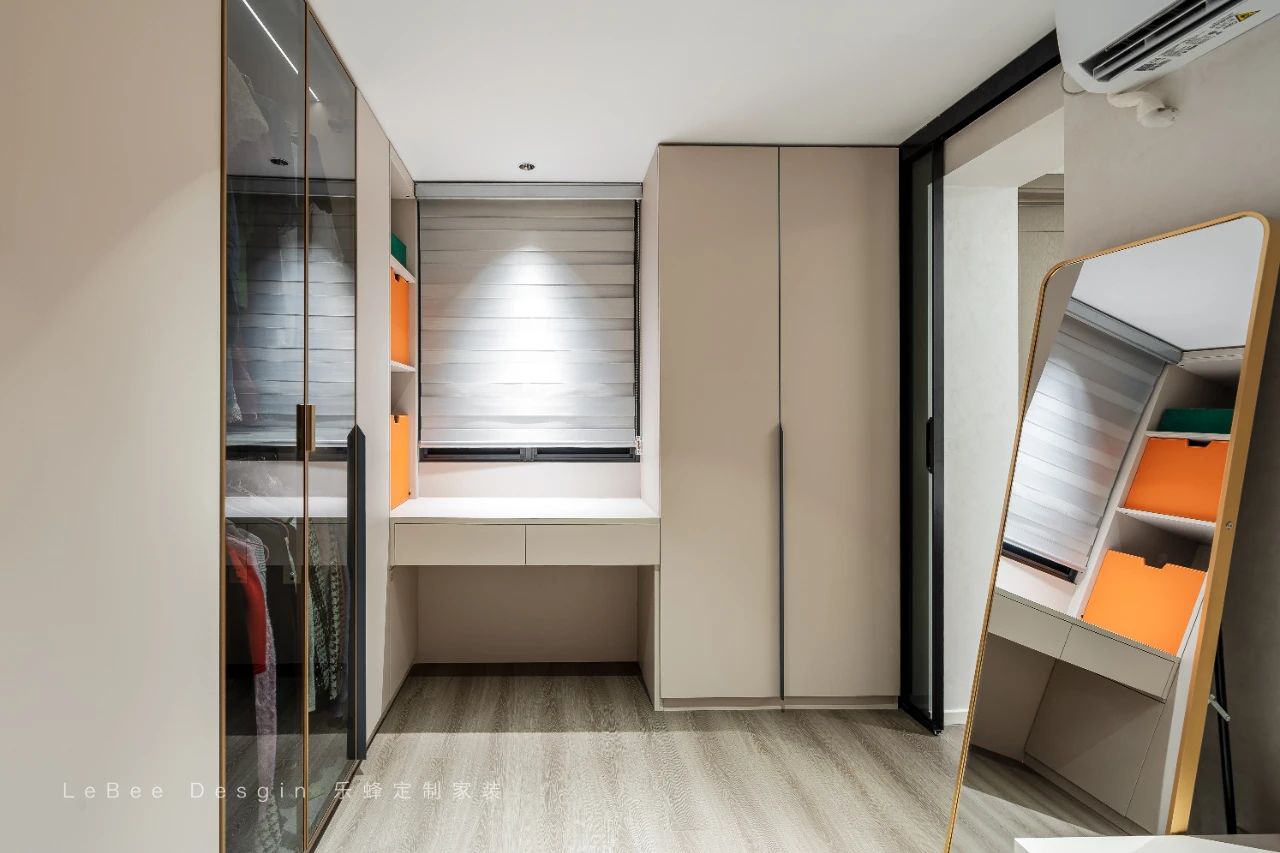 打造衣帽間通道,直接通向主衛。順應洗漱、換衣、化妝的動線,節約居者時間。在衣柜內加入燈帶,所有衣服一覽無遺,衣服查找搭配更方便。