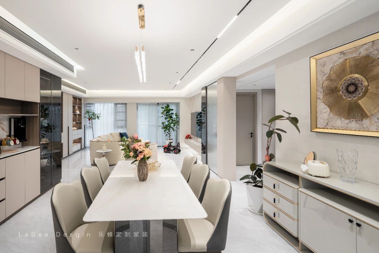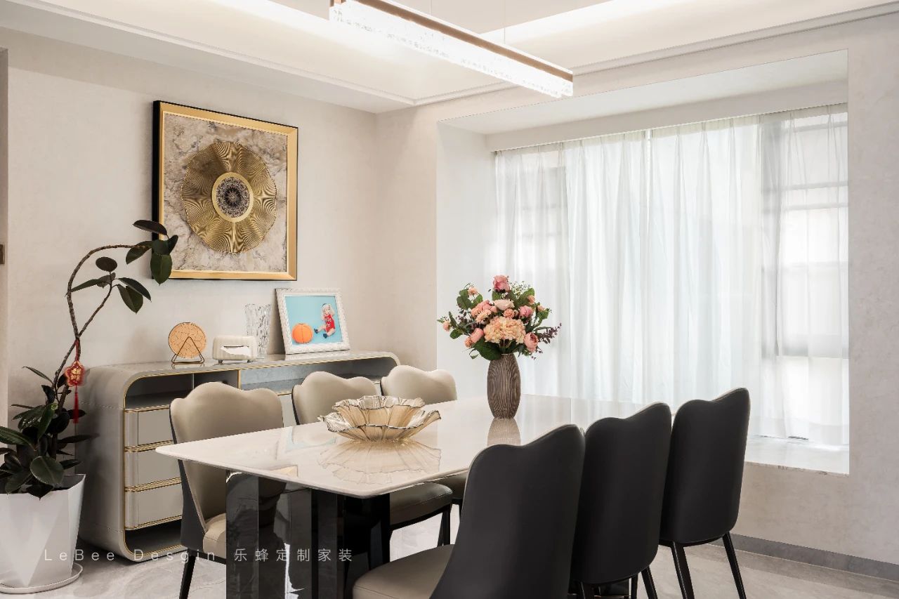 餐邊柜上方擺入獨特的不規則圓環造型,宛如一件精致的藝術品,瞬間提升了整個空間的氣質與格調,為用餐時光帶來別具一格的氛圍體驗。