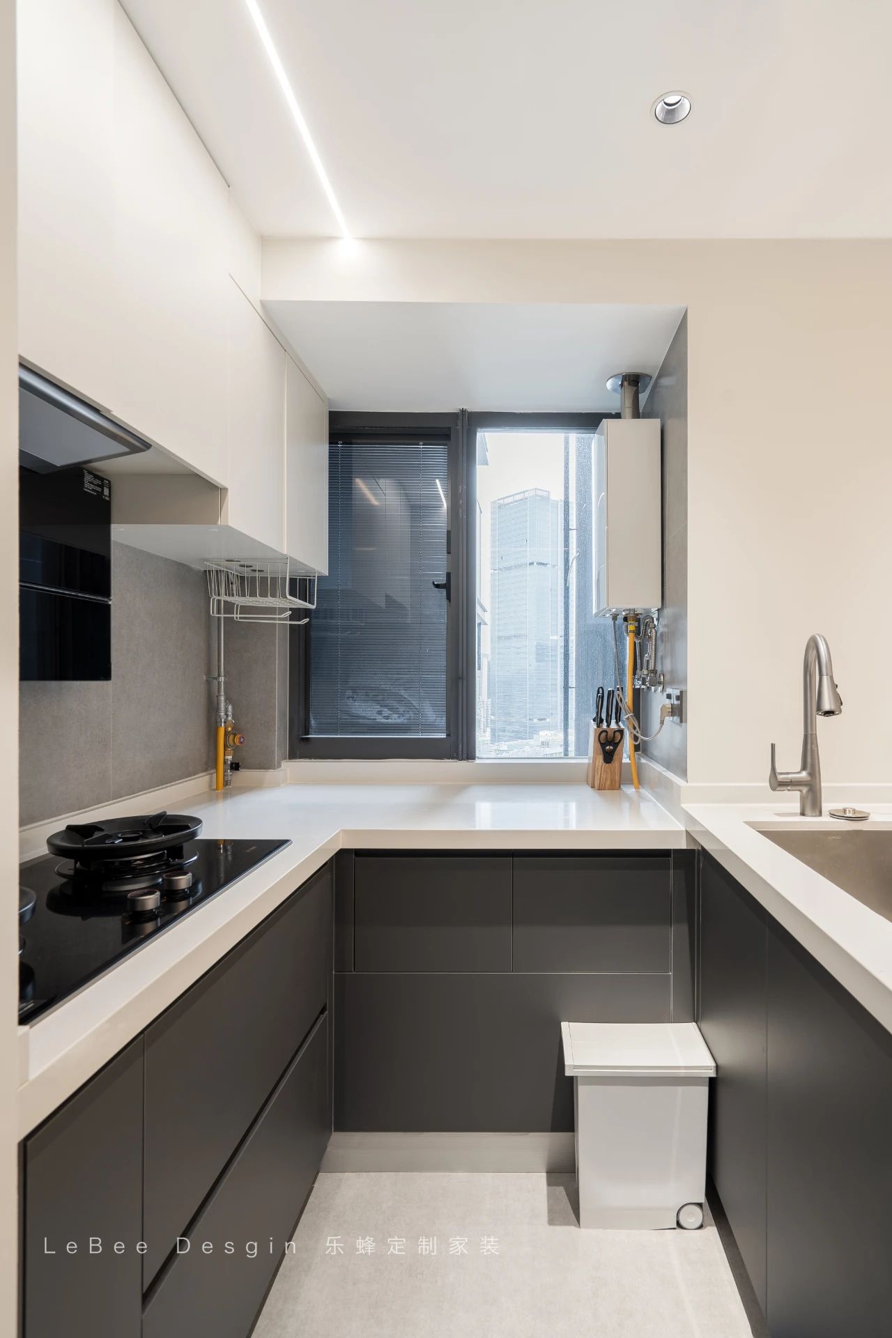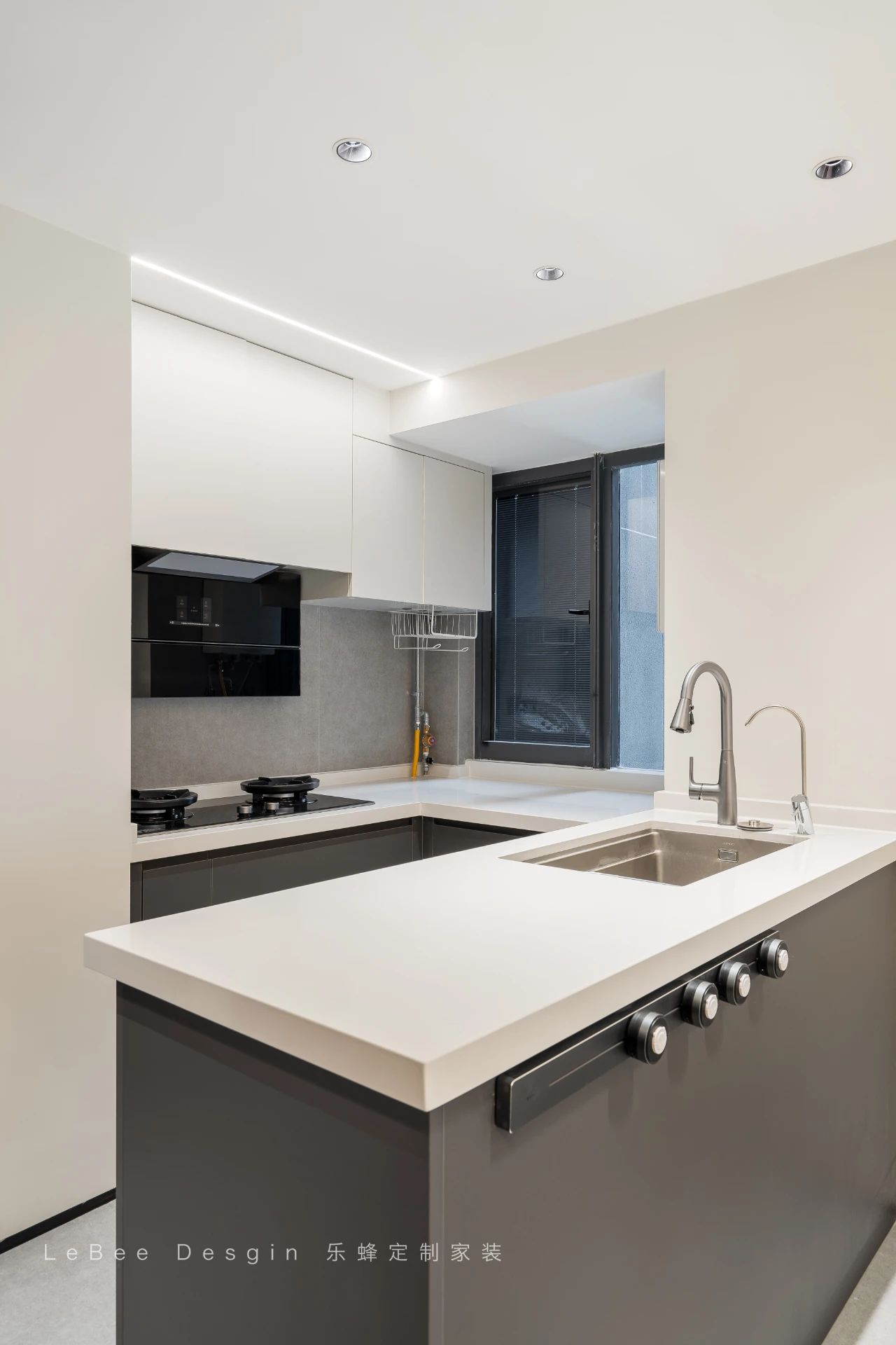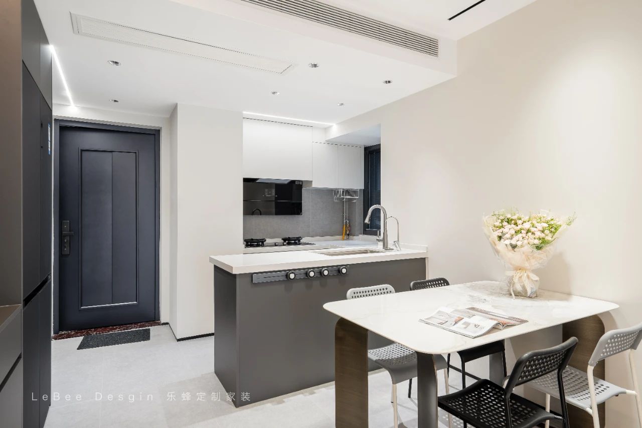純白餐廚空間搭配深藍色柜體,讓整體空間更明亮。餐廚一體的設計,開放式廚房讓餐廚空間秒大一倍。
