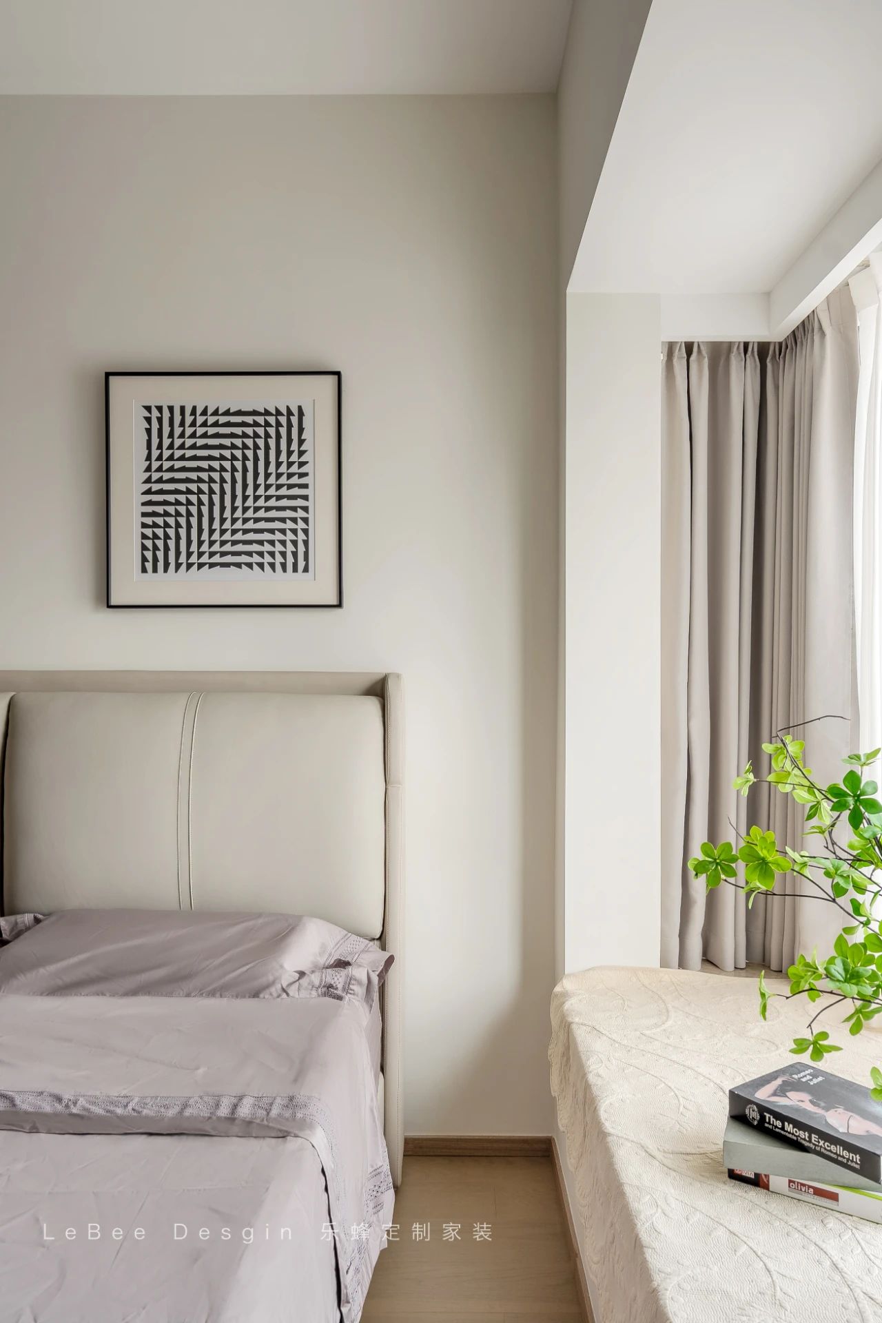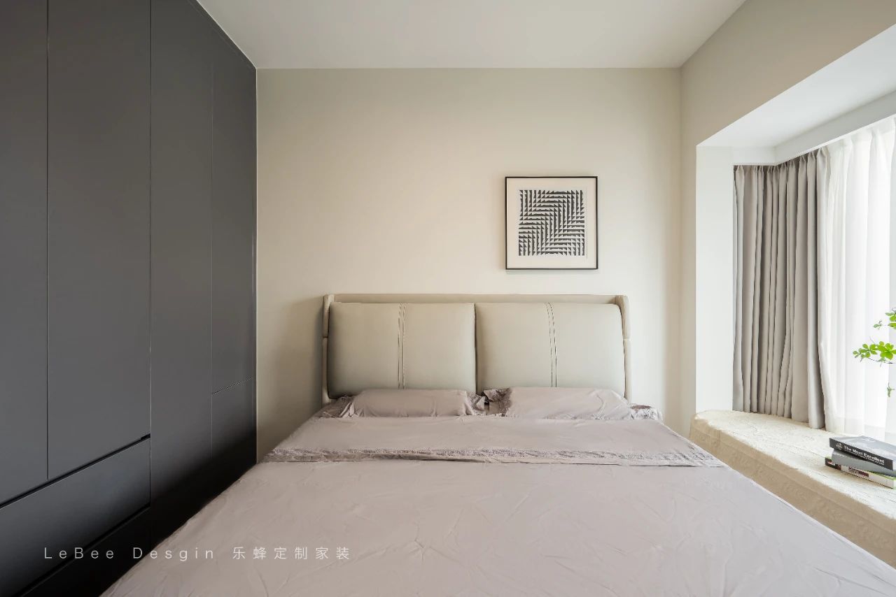 床頭背景增加一些藝術畫飾,打破單調感同時營造一定的藝術氣息,簡約而不簡單。衣柜做一門到頂,不積灰還美觀耐看。