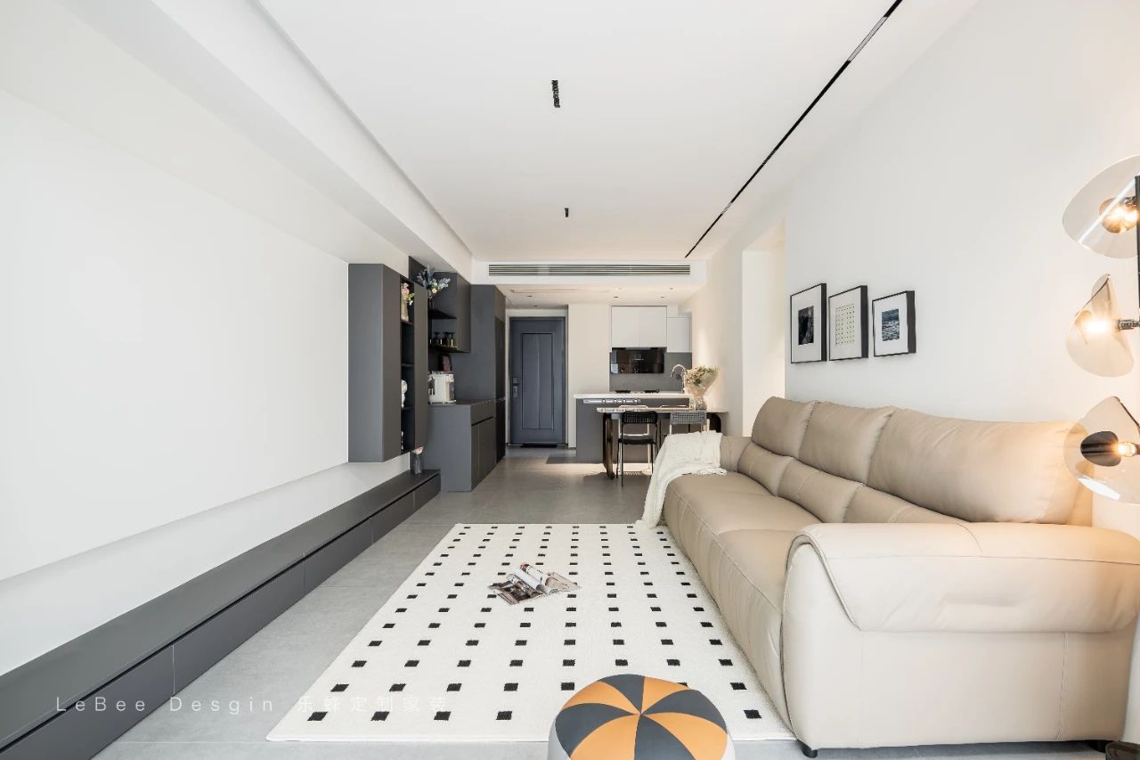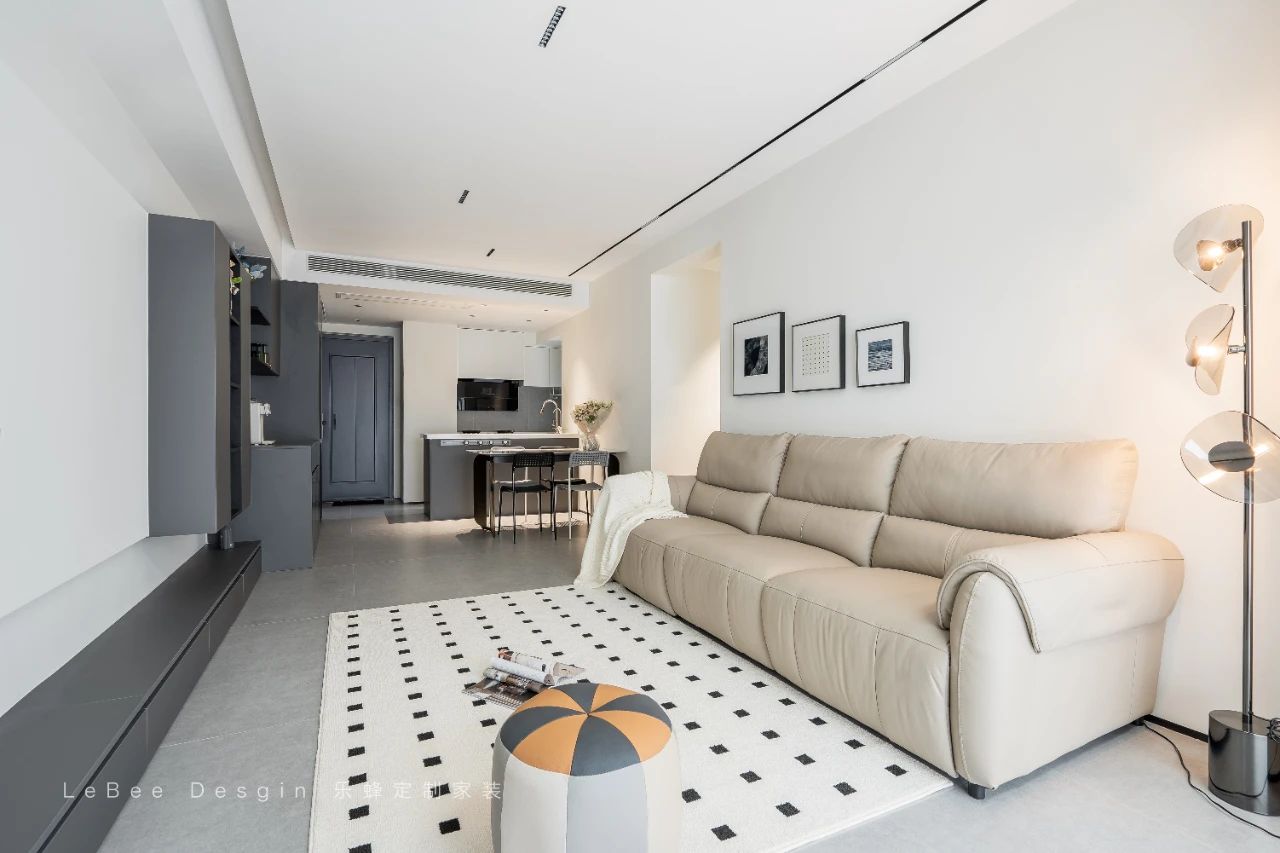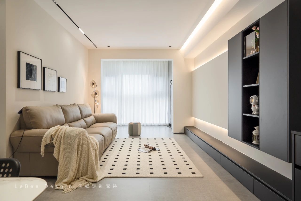 客廳打通陽臺,除了陽臺定制柜為了藏水管以外,沒有任何定制柜體,保證一定的空間,整個客廳也會顯得更加寬敞。無茶幾設計,后期選擇可移動小邊桌更加方便靈活。