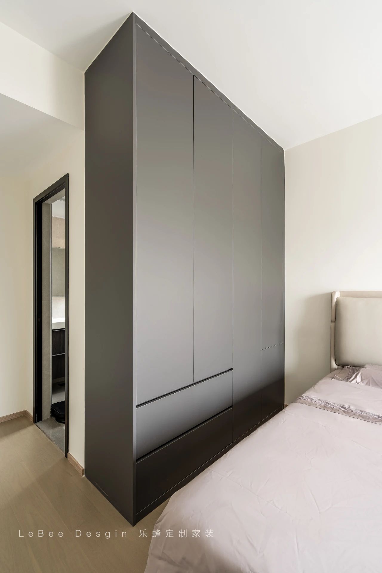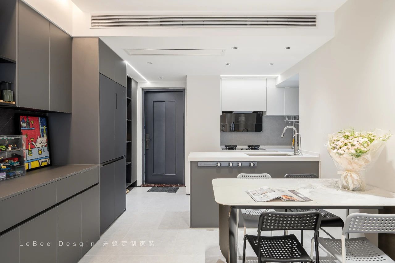 全屋收納也應做“減法”,定制柜體加按壓式柜門,視覺干凈大氣,也為極簡家增添了不少質感。