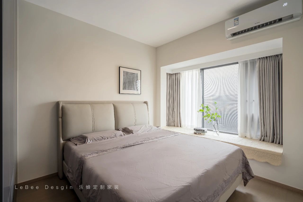 床頭背景墻通刷米白色乳膠漆設計,配合燈帶營造氛圍感,選擇造型簡單的落地式床。