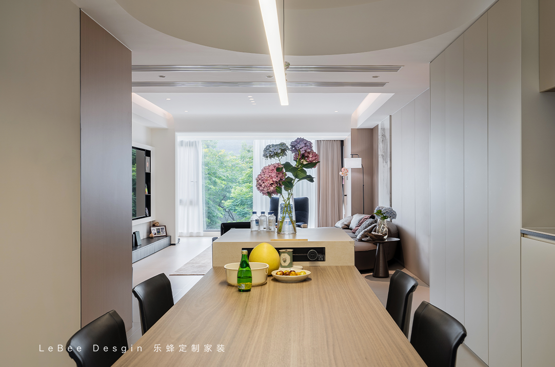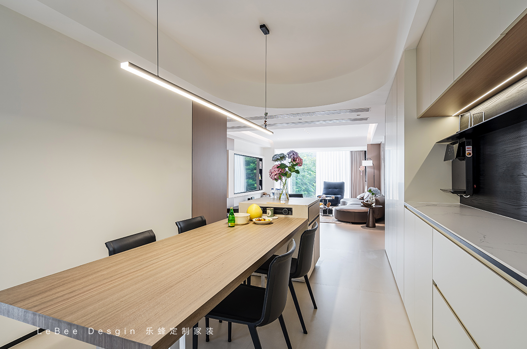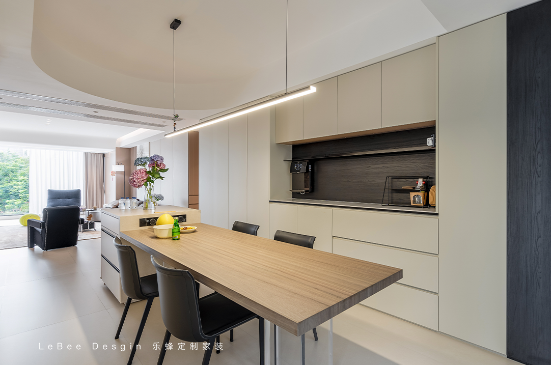 考慮到偶爾有家庭或朋友聚餐,餐廳選擇了長桌。原木餐桌+黑色餐椅點綴,讓整體溫馨又大氣。