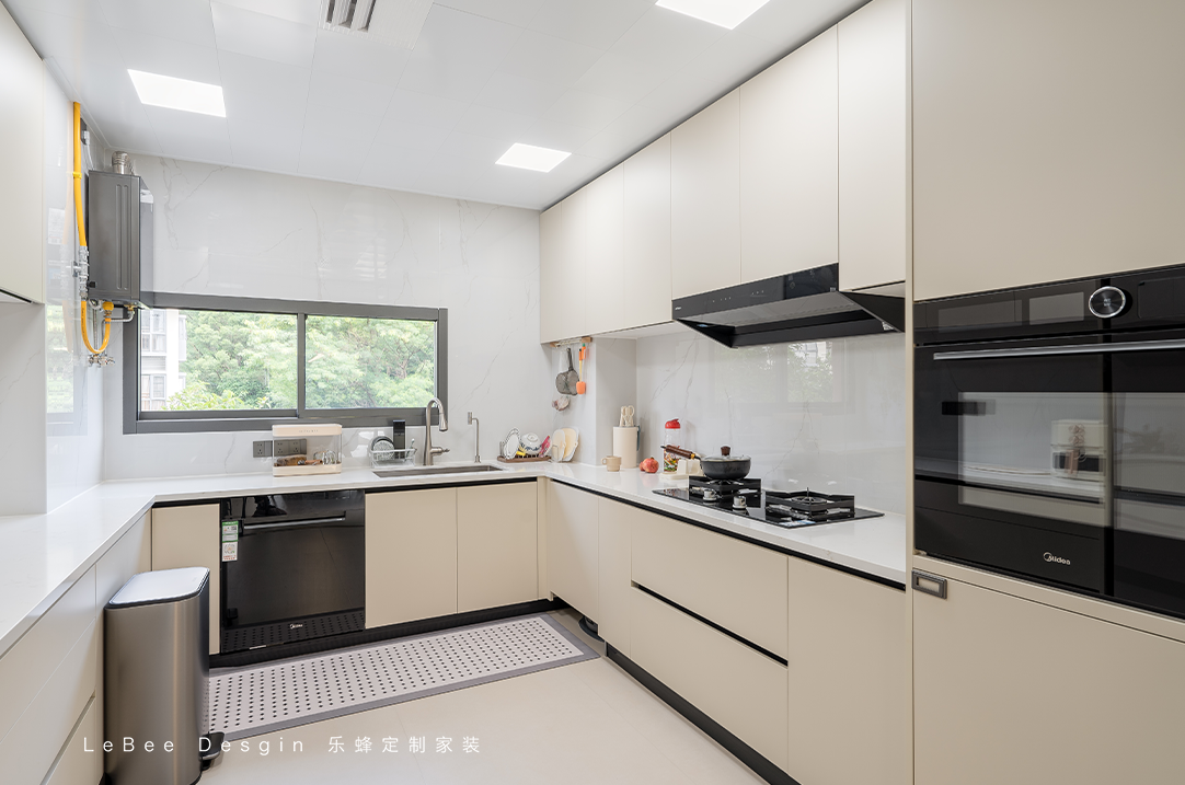 廚房U型設計,洗菜切菜炒菜都很方便,動線合理。選擇上下柜同色系,看起來整體效果更好,內嵌入冰箱、蒸烤箱一體機,嚴絲合縫,更省空間。
