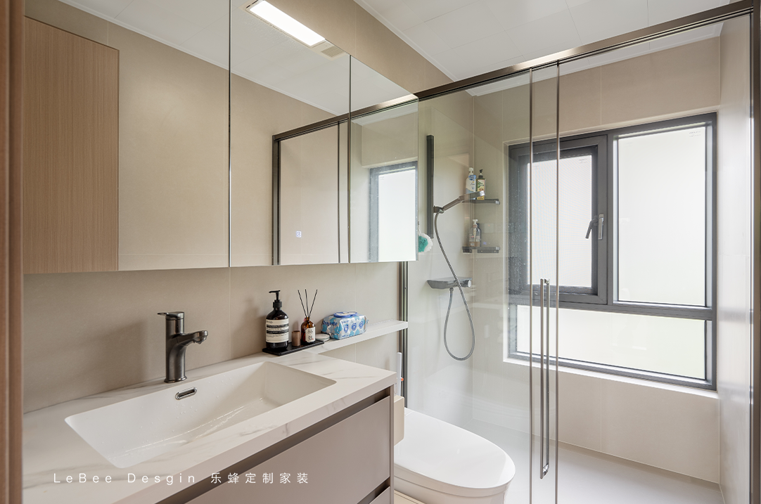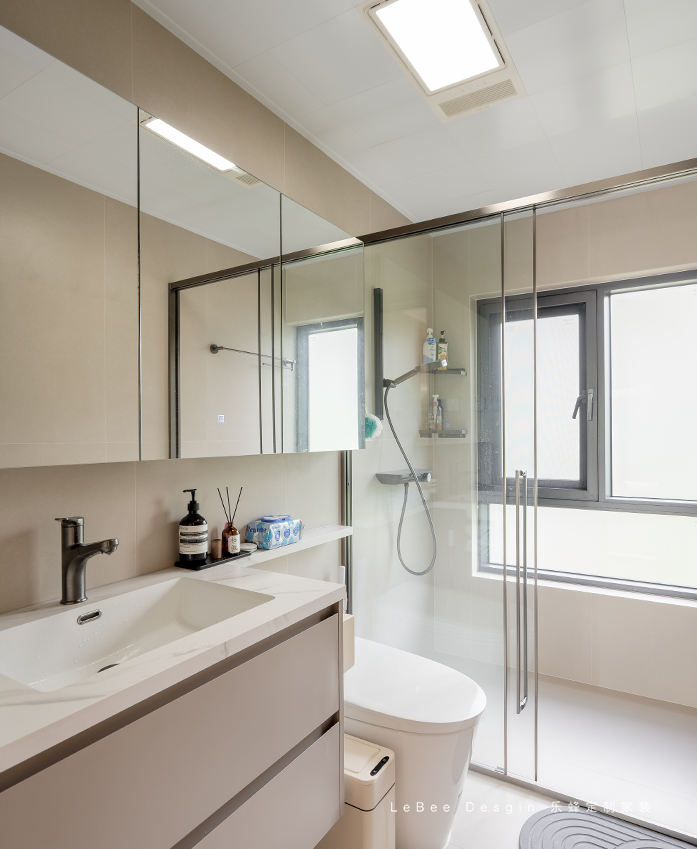 衛生間遵循業主的需求做了干濕分離,延續客廳的風格,大面積的白色瓷磚讓空間顯得更加寬敞明亮。