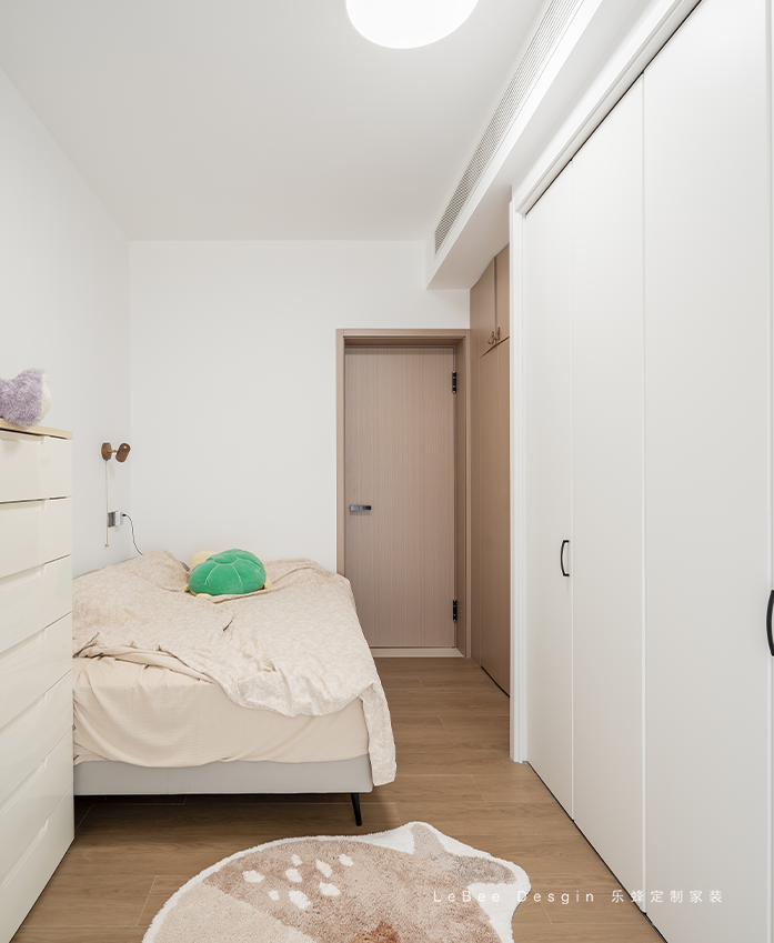 利用床尾打造一整排的淺白色衣柜,滿足日常收納需求的同時,也讓整體色調更加協調統一~