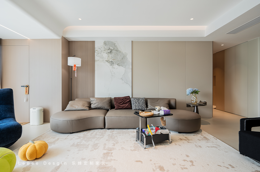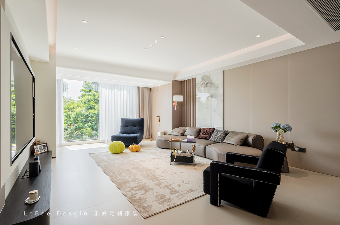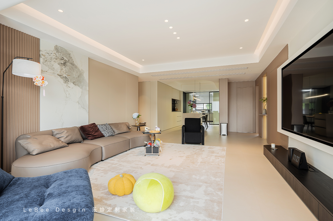整體是一個大橫廳,淺色系搭配,墻面也不做如何復雜設計,局部的黑咖色點綴便凸顯出了整體的層次感,看上去溫馨高級感十足。