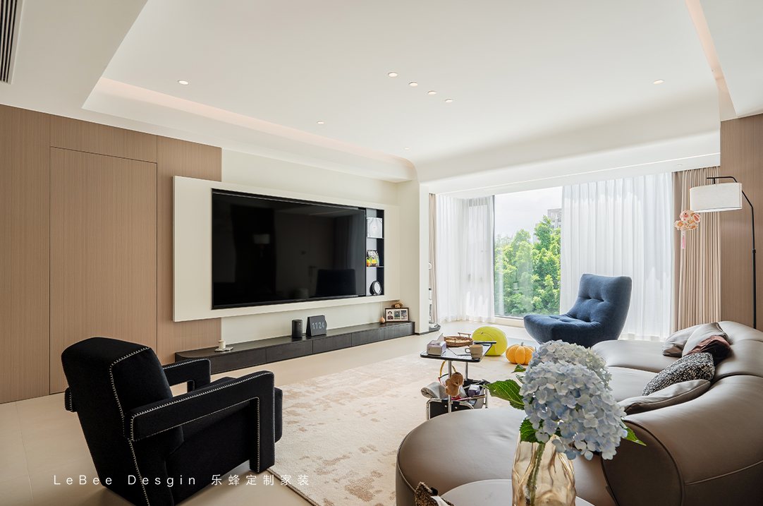 客廳整體以清雅高級的氛圍為主,整體背景墻采用淺色的乳膠漆設計,再搭配上木飾面的點綴,深淺色調的碰撞設計增加了客廳整體的層次感。