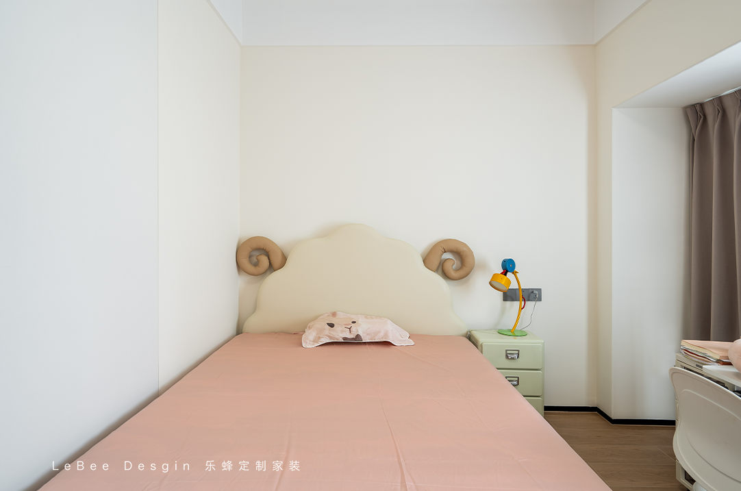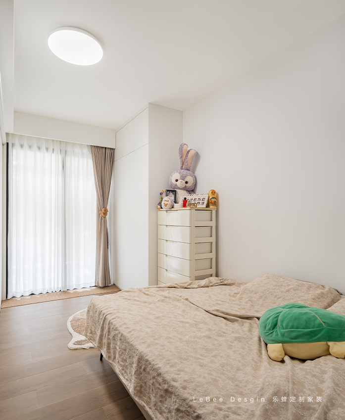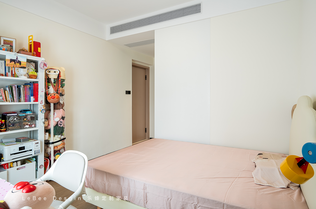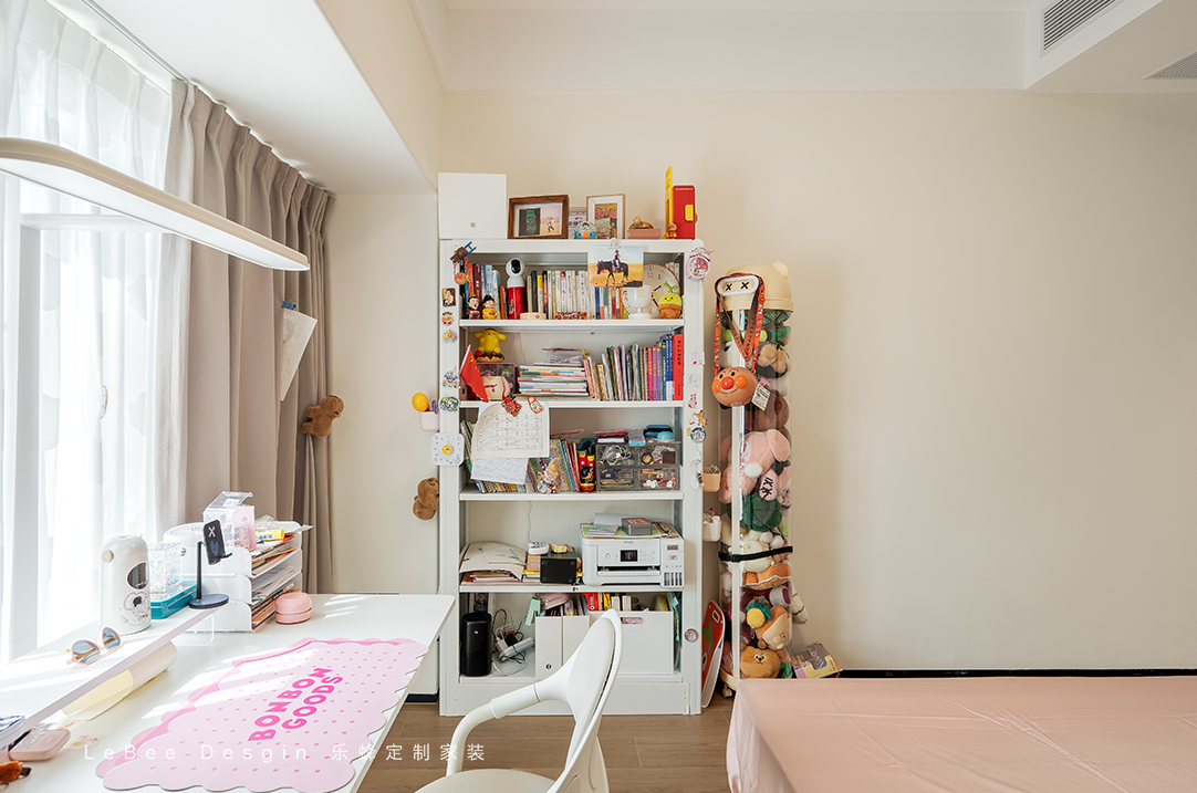 兒童房整體色調以淡雅的米白色為主,奶fufud超溫柔,給人寧靜舒適的感覺。靠墻放置一個落地架子增加收納空間