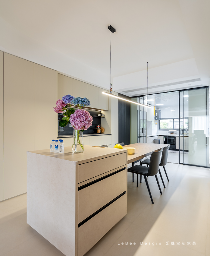 大量自然光線從廚房的窗戶進入,給人明亮舒適的感覺餐廳和廚房用玻璃門隔,既隔絕油煙但廚房內外的人還是可以進行互動,廚房不再是一座孤島。