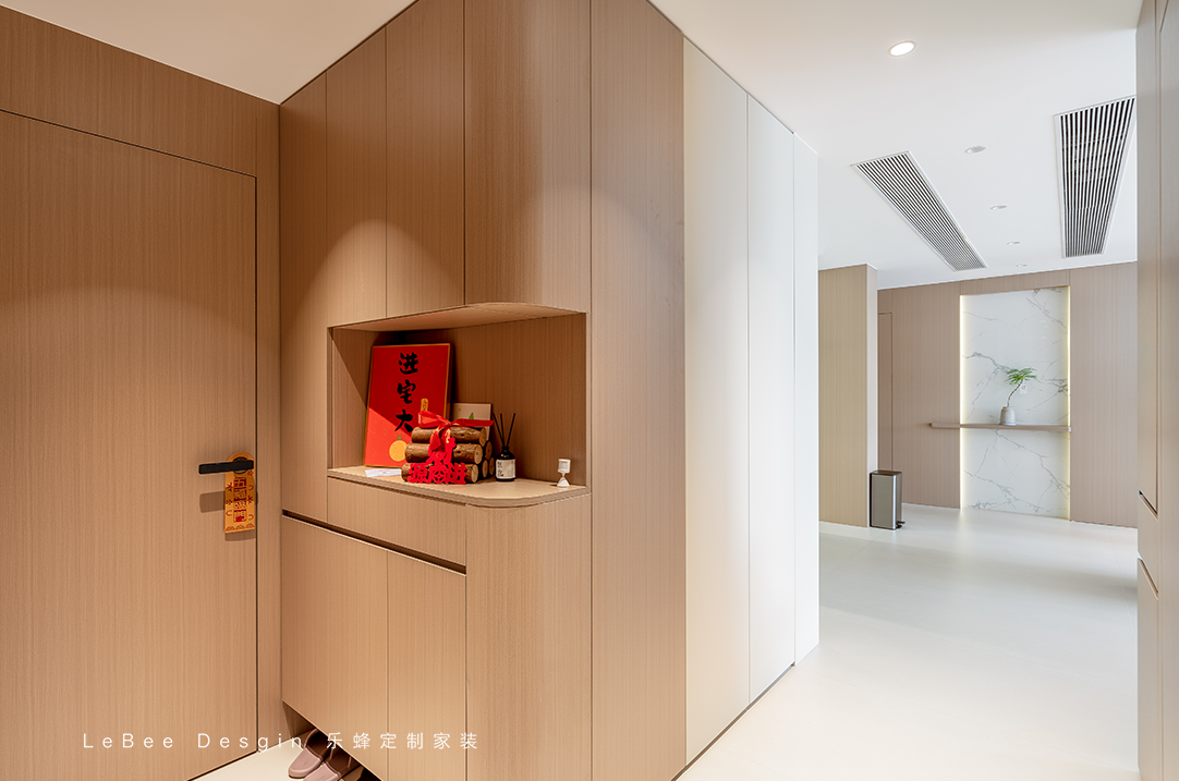 玄關轉角做圓弧處理,整體原木色+奶白色拼接,超有氛圍感,中間留空設計,可作為展示柜,放置一些裝飾品。