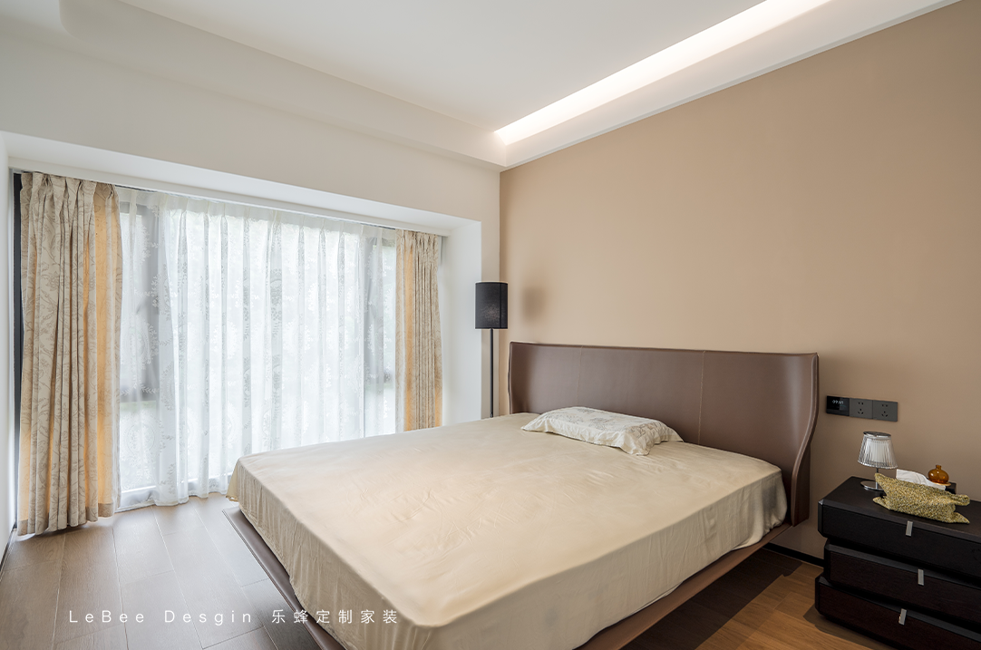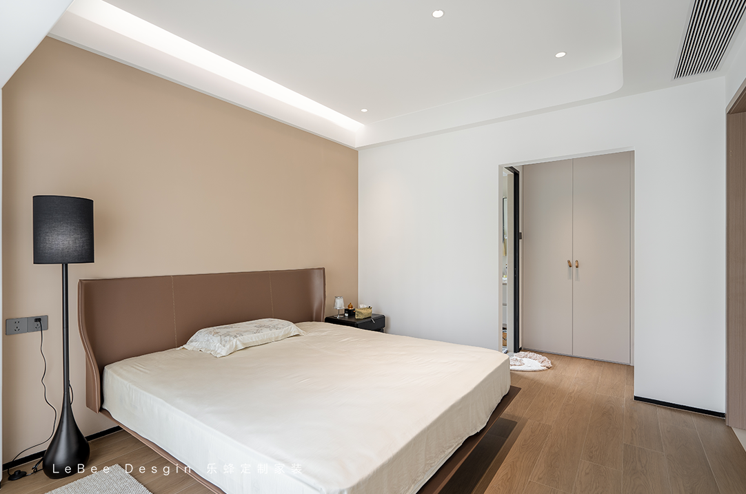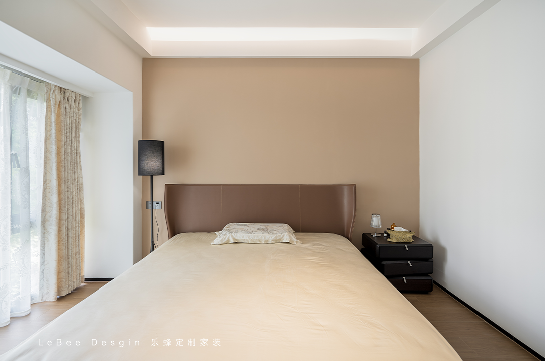 主臥室延續了整體的簡約風格,以淺色色主,加上深咖色點綴,木地板營造出臥室的溫暖感,讓人感覺非常舒適。