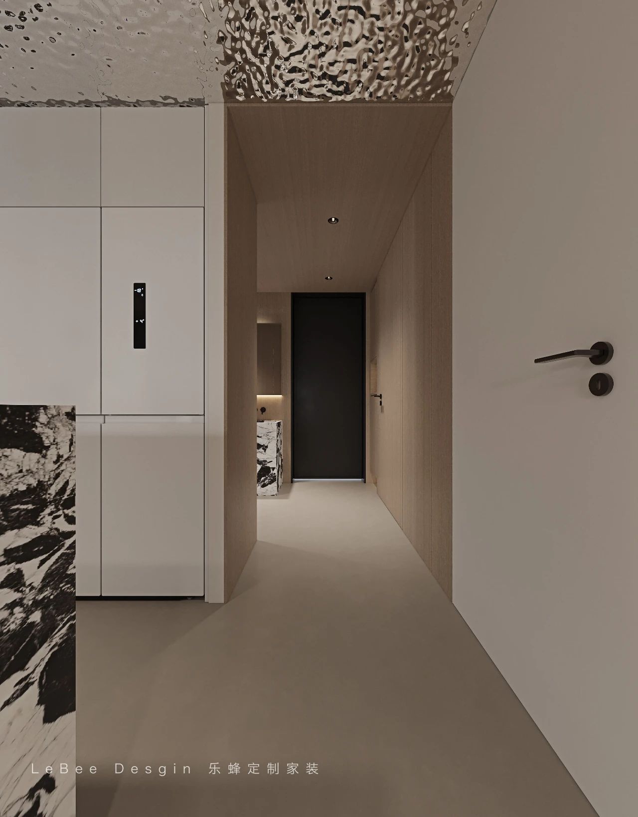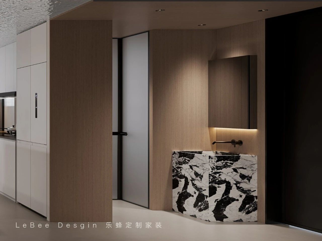 定制的柜體功能緊湊卻十分全面,有放置次凈衣的區域、放鞋的空間以及放小物件的抽屜。整個空間以低飽和度的木色為主基調,巧妙地融入具有沖擊感的黑色作為點綴,完美詮釋出極簡的高級感和時尚感,超有格調。