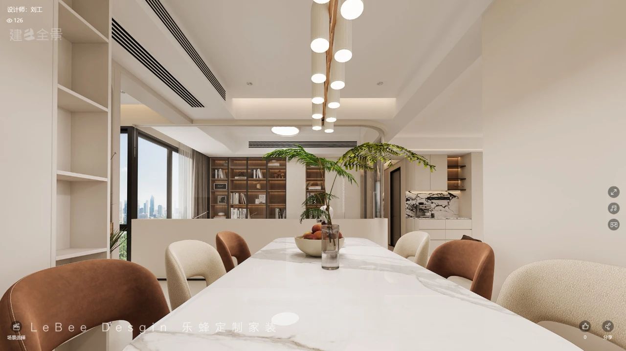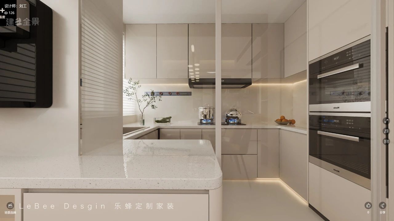 - 廚房效果圖 - 餐廳對面靠墻打造整面西廚區,淺色清新的家居搭配讓整體空間更加溫馨自然。夕陽西下,客廳的風景如詩如畫,令人沉醉。