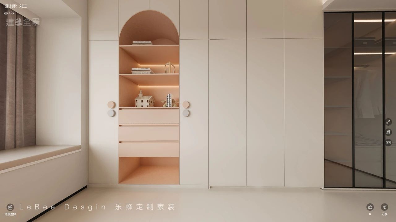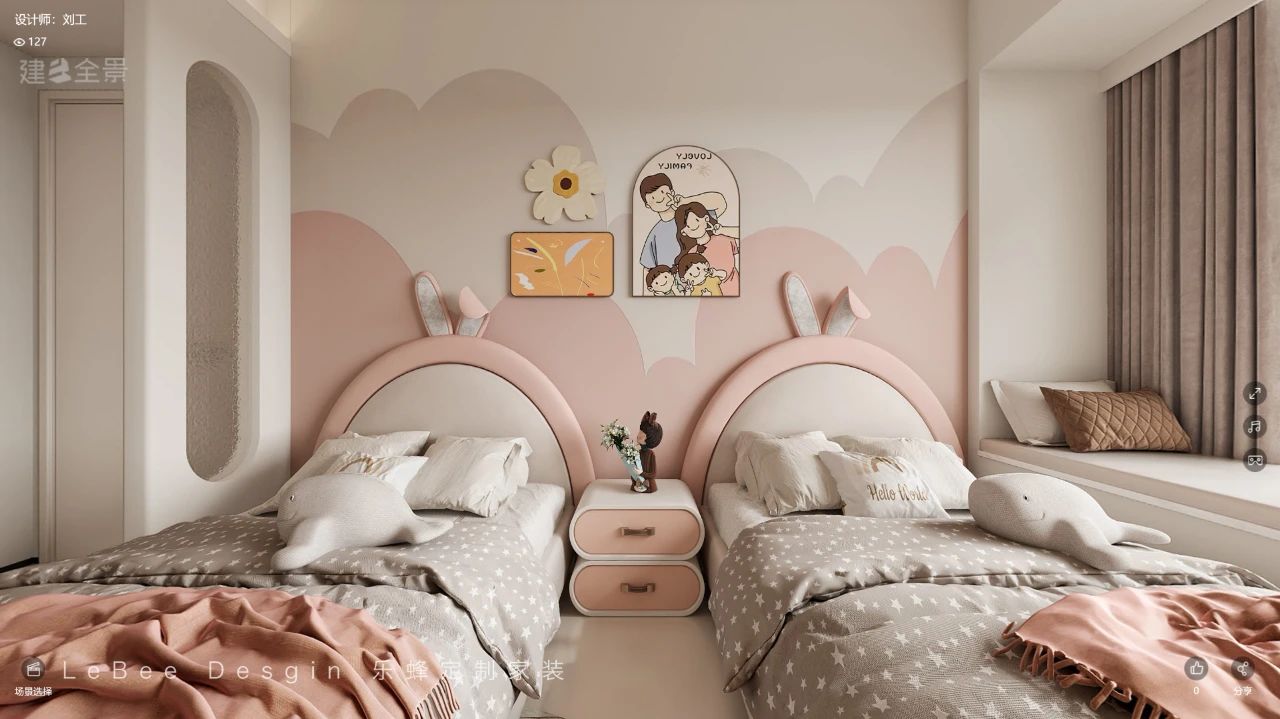 - 兒童房效果圖 - 整體配色選用白色和粉色系。在粉色的選擇上十分考究,飽和度太高容易讓人視覺疲勞,明度太高則略顯土氣。