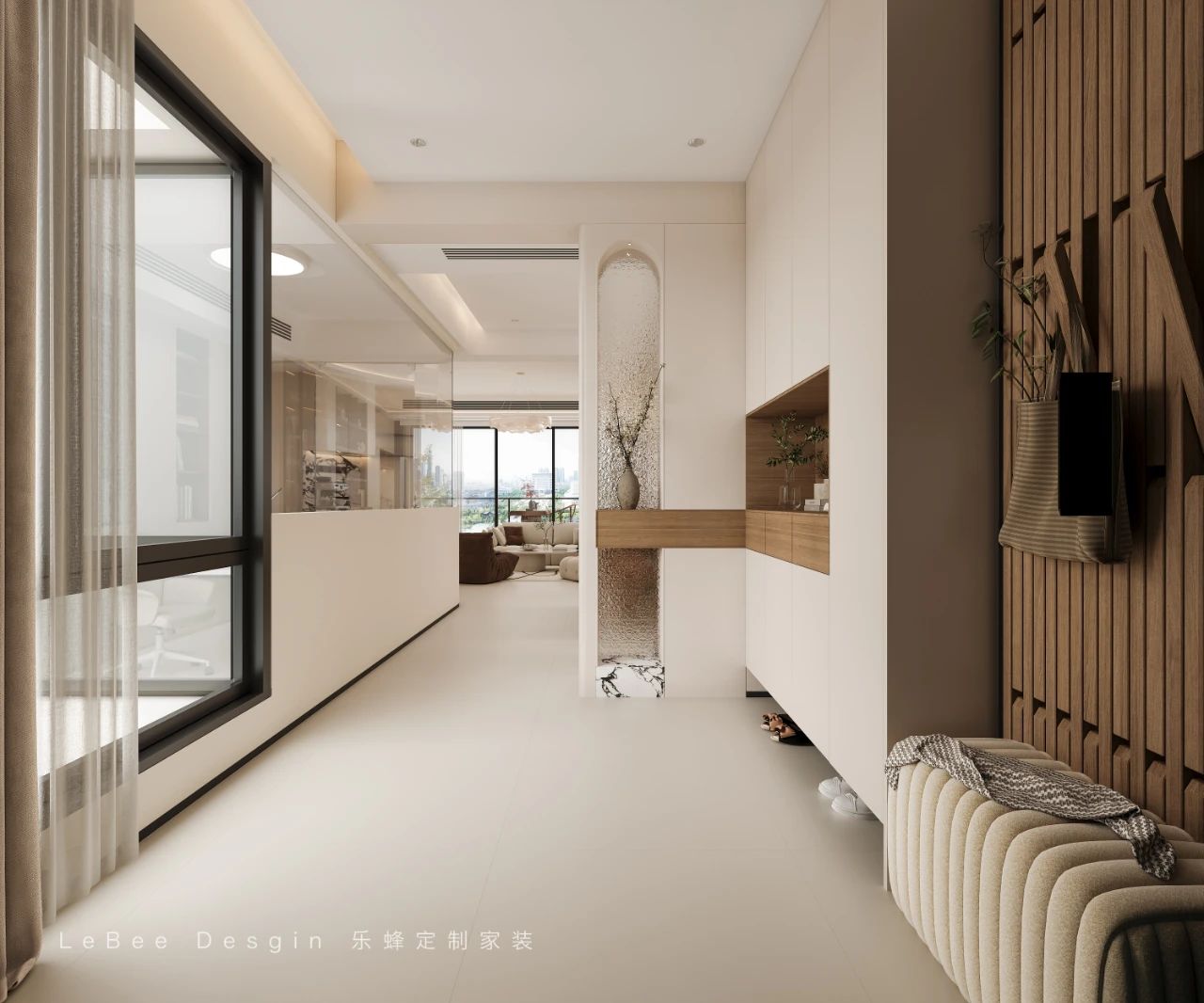 素色柔光轉與清透玻璃材質相得益彰,為空間賦予了流動的層次感,讓人感受到寧靜與舒適。去客廳化的設計充分考慮了屋主的需求,摒棄傳統沙發和電視,融合會客、觀影以及孩子學習的書房等多種功能。