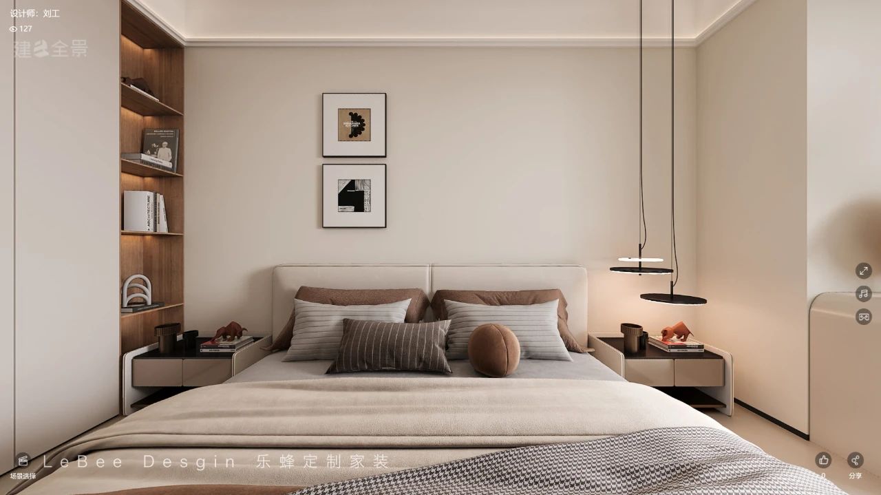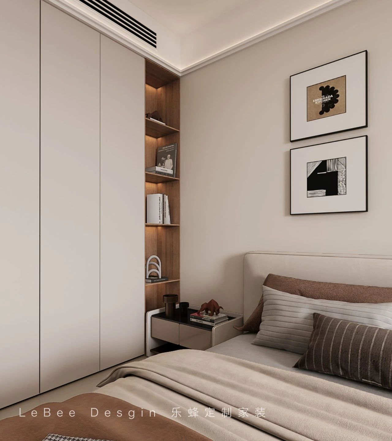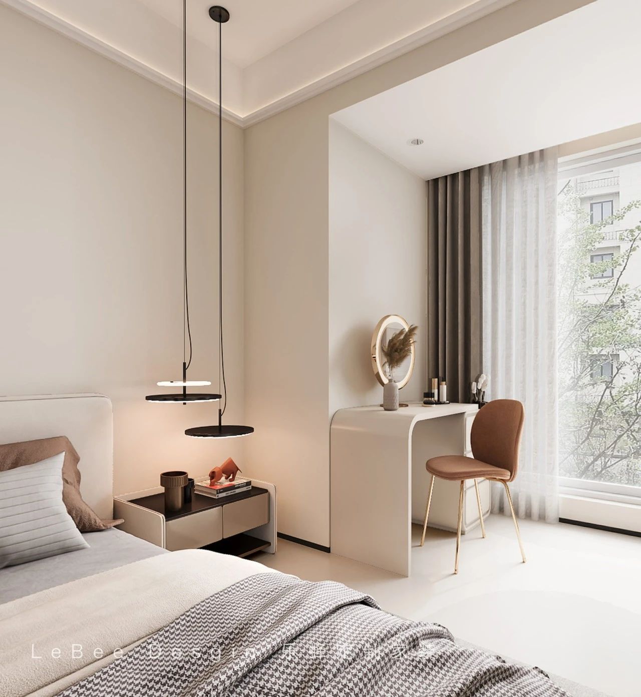 - 主臥效果圖 - 主臥采用無主燈設計,柔光轉搭配低飽和度的色調,盡顯精致與優雅。溫柔的奶油風,淺色系的床頭與奶白色背景墻相互呼應,增加了空間的層次感。