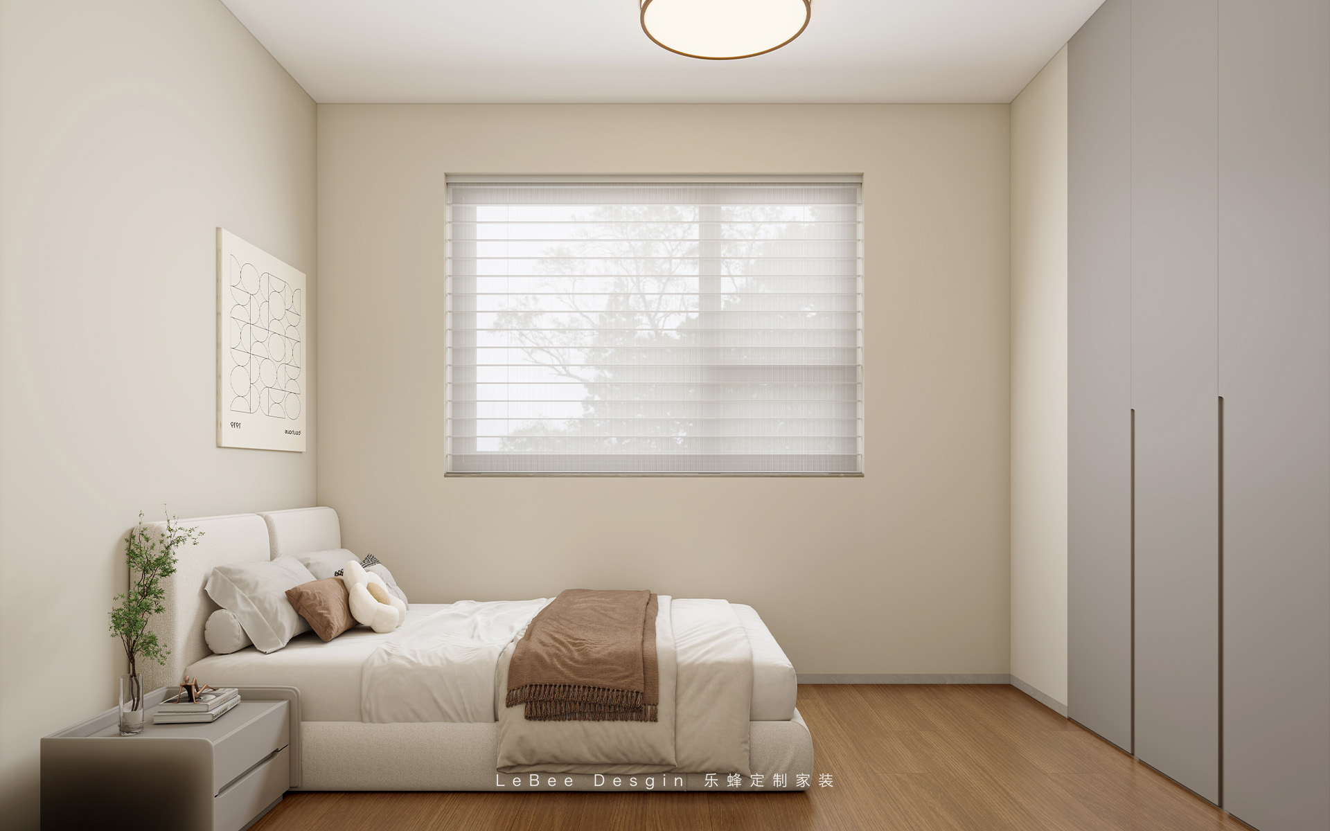 - 次臥效果圖 - 次臥與整體空間協調統一簡潔溫馨,木地板通鋪,床尾打造一整排衣柜,滿足業主收納需求~