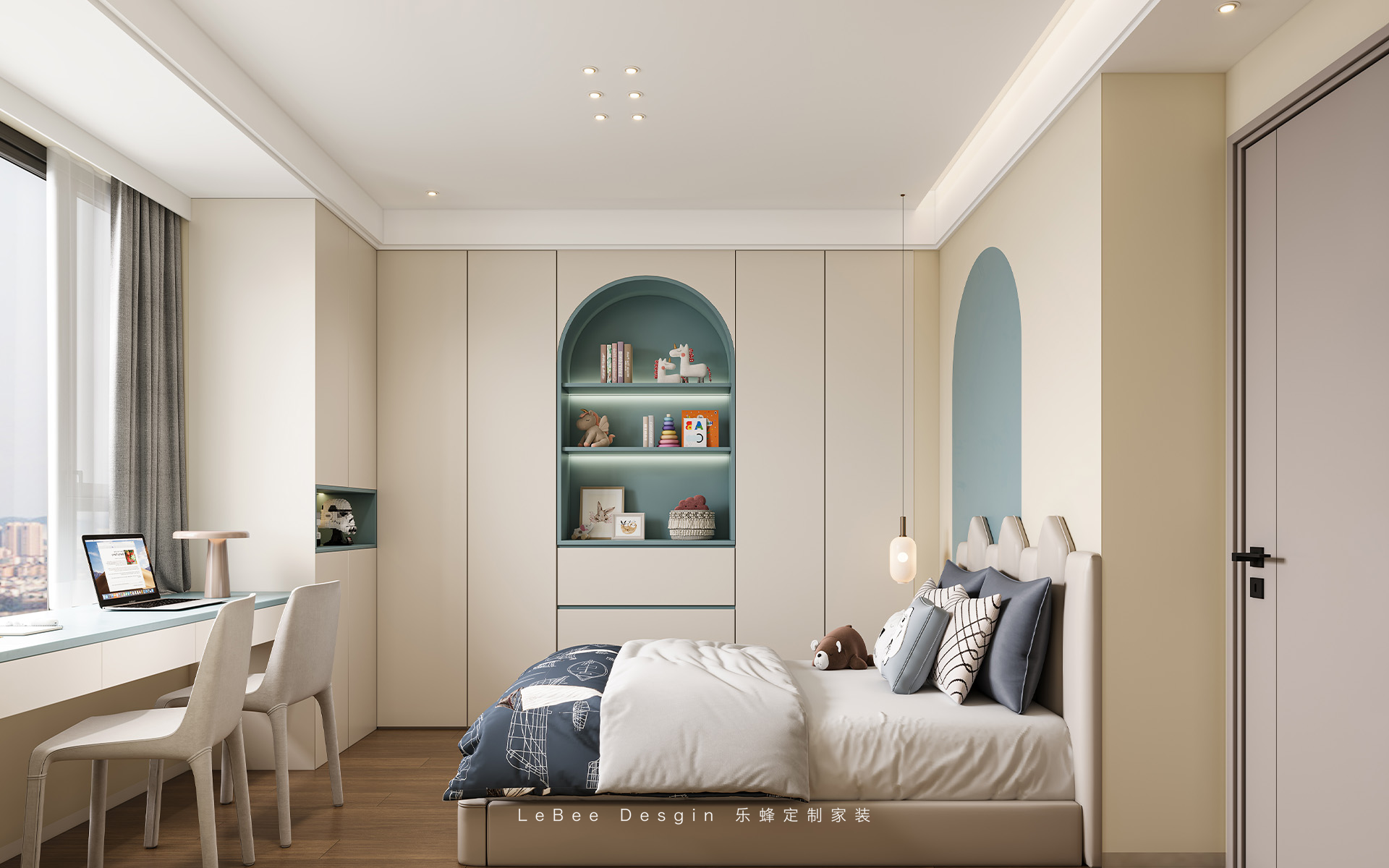 - 兒童房效果圖 - 兒童房采用了明快的色彩,書桌+衣柜一體化設計,增添了活力和趣味。在這里,感受到生活的活力和活潑的氣息。