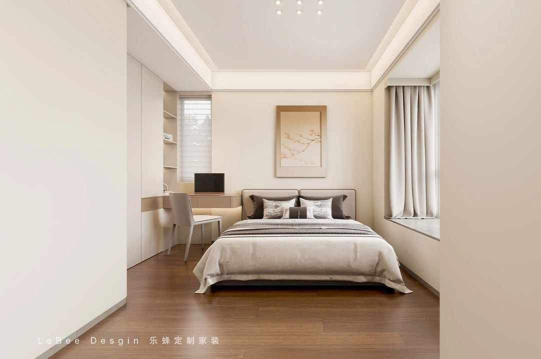 - 主臥效果圖 - 臥室色彩選擇比較沉穩內斂的淡黃色,打造懸浮書桌+一門到頂的衣柜,滿足業主儲物空間的同時,也渲染出簡潔而不失優雅的氛圍感。