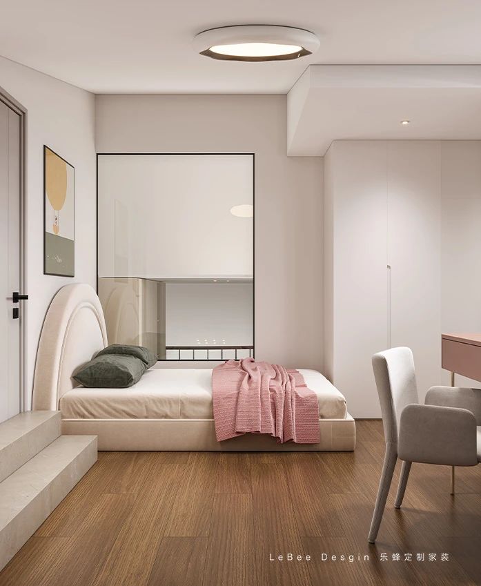 女孩房的設計非常簡單粉嫩可愛,空間整體采用原木+淺色系組合,木地板通鋪,弧形床頭造型、靠邊做一組衣柜,打造一個干凈簡約的生活環境~