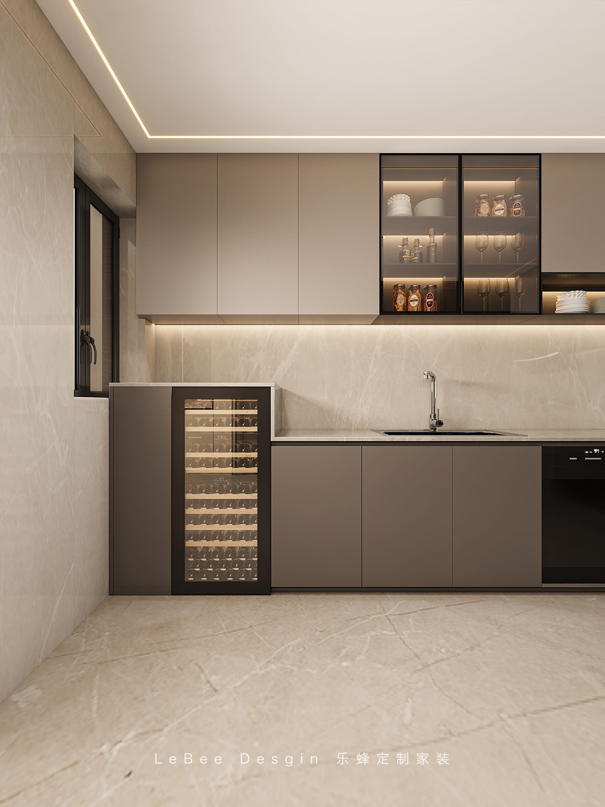 - 廚房效果圖 - 廚房采用開放式設計,設計了收納柜滿足儲物需求,并增加了開放格,方便日常烹飪時放置隨手隨用的調料,所有廚電做嵌入式設計,視覺更簡潔大氣。