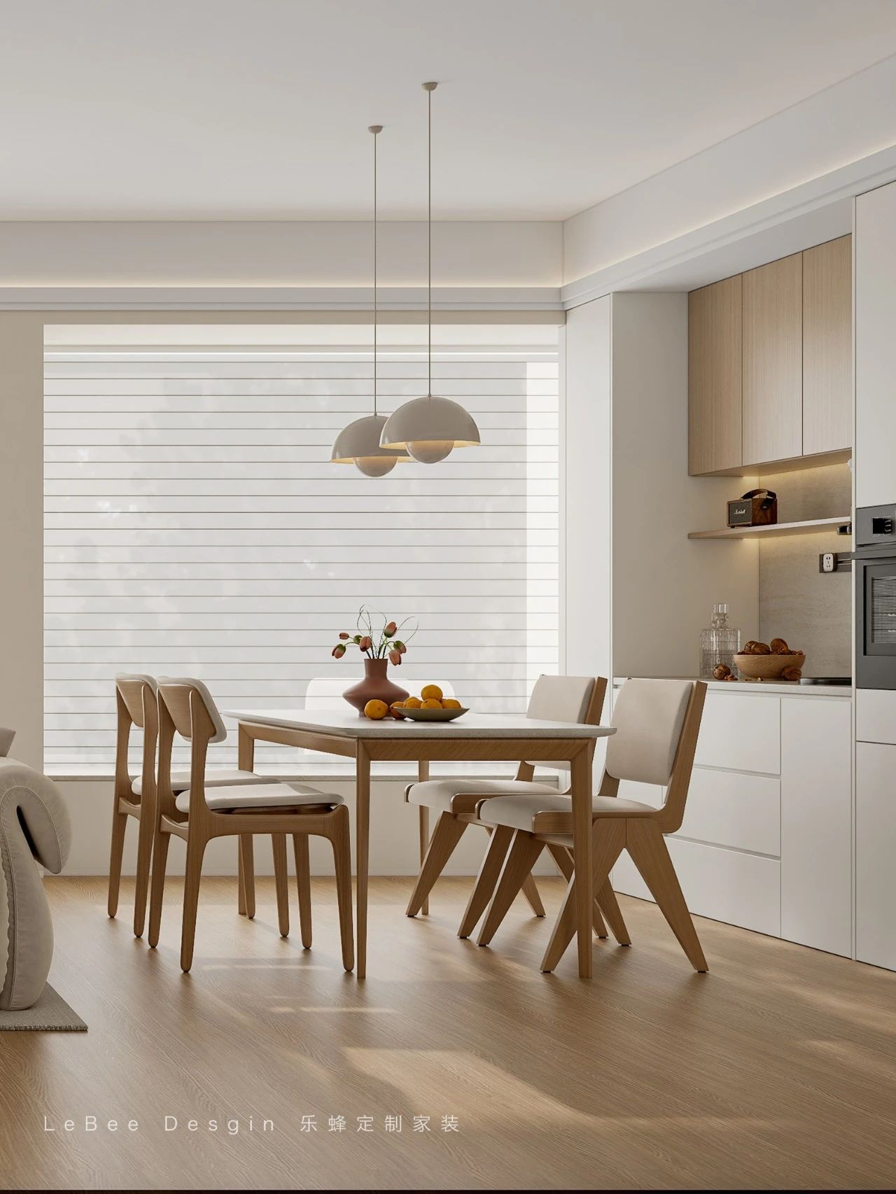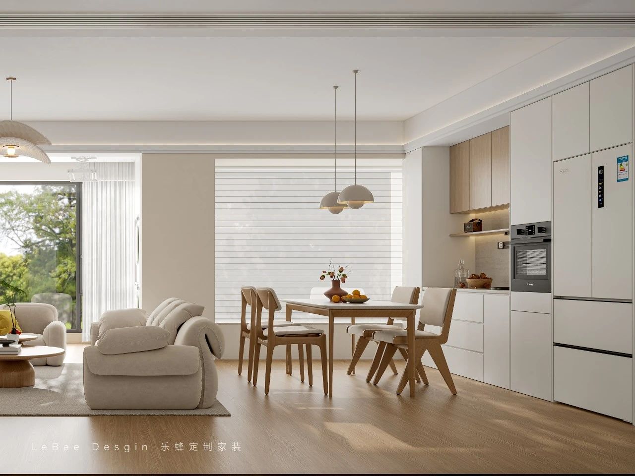 - 餐廳效果圖 - 沙發后面做開放式餐廚區域,空間更顯寬敞與自然,西廚區做水吧臺、定制收納柜內嵌冰箱定制柜體,增加了家庭收納空間,整體顏值,與實用性并存!