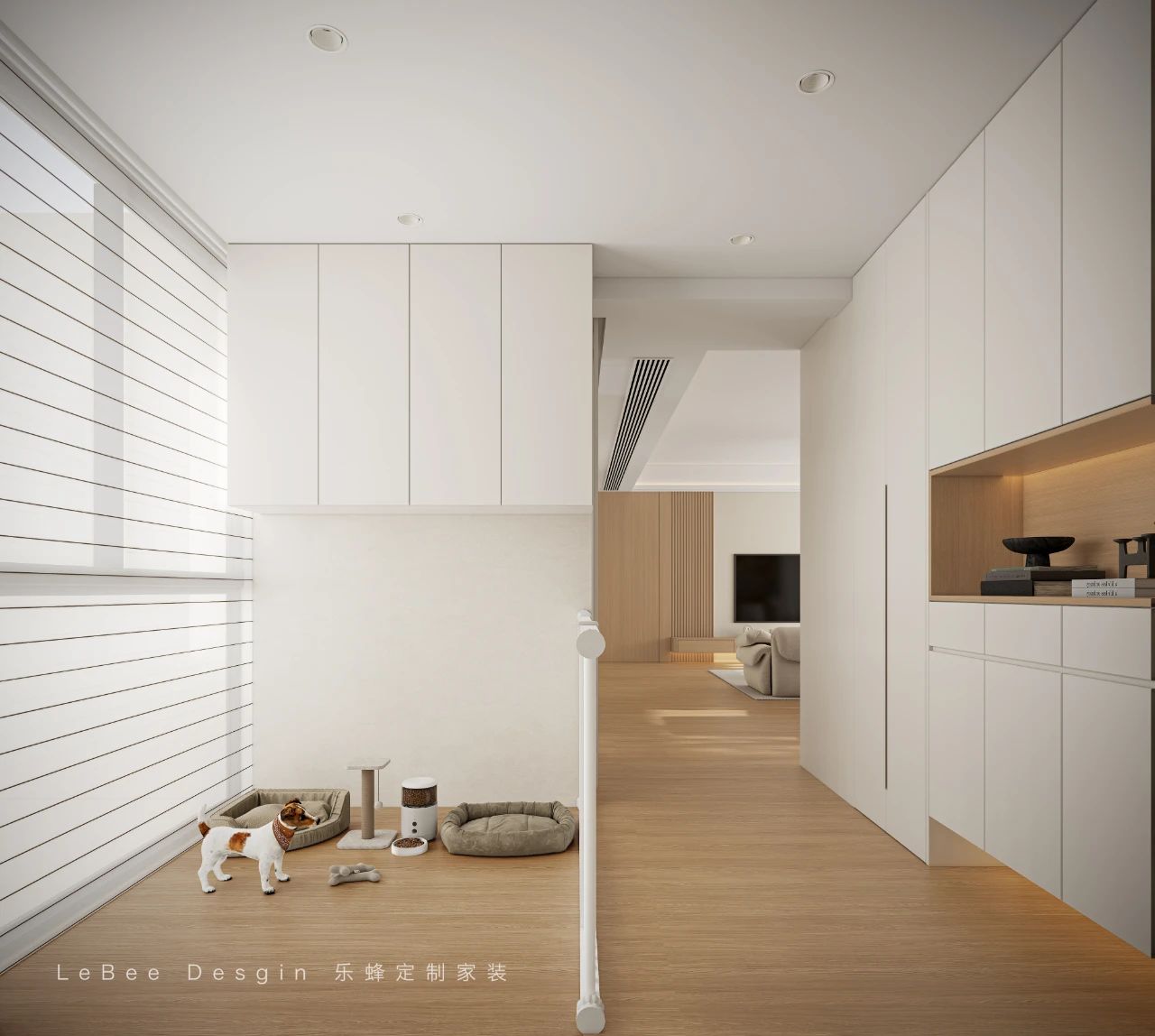 - 入戶左側打造換鞋區+收納柜 一眼望到窗的通透,給足歸家儀式感,女主人有心愛的寵物,右手邊則設計寵物休閑區。