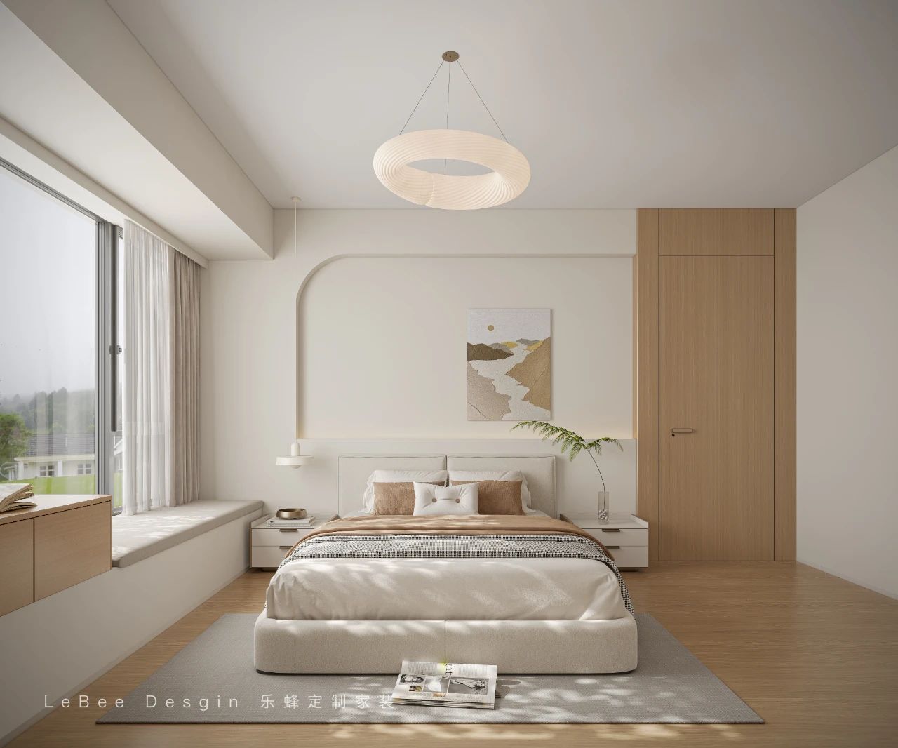 - 主臥效果圖 - 臥室墻地面顏色統一協調,墻面選用奶可可、蛋奶色等柔和色調,通鋪木地板,帶來舒緩輕松的體驗感。