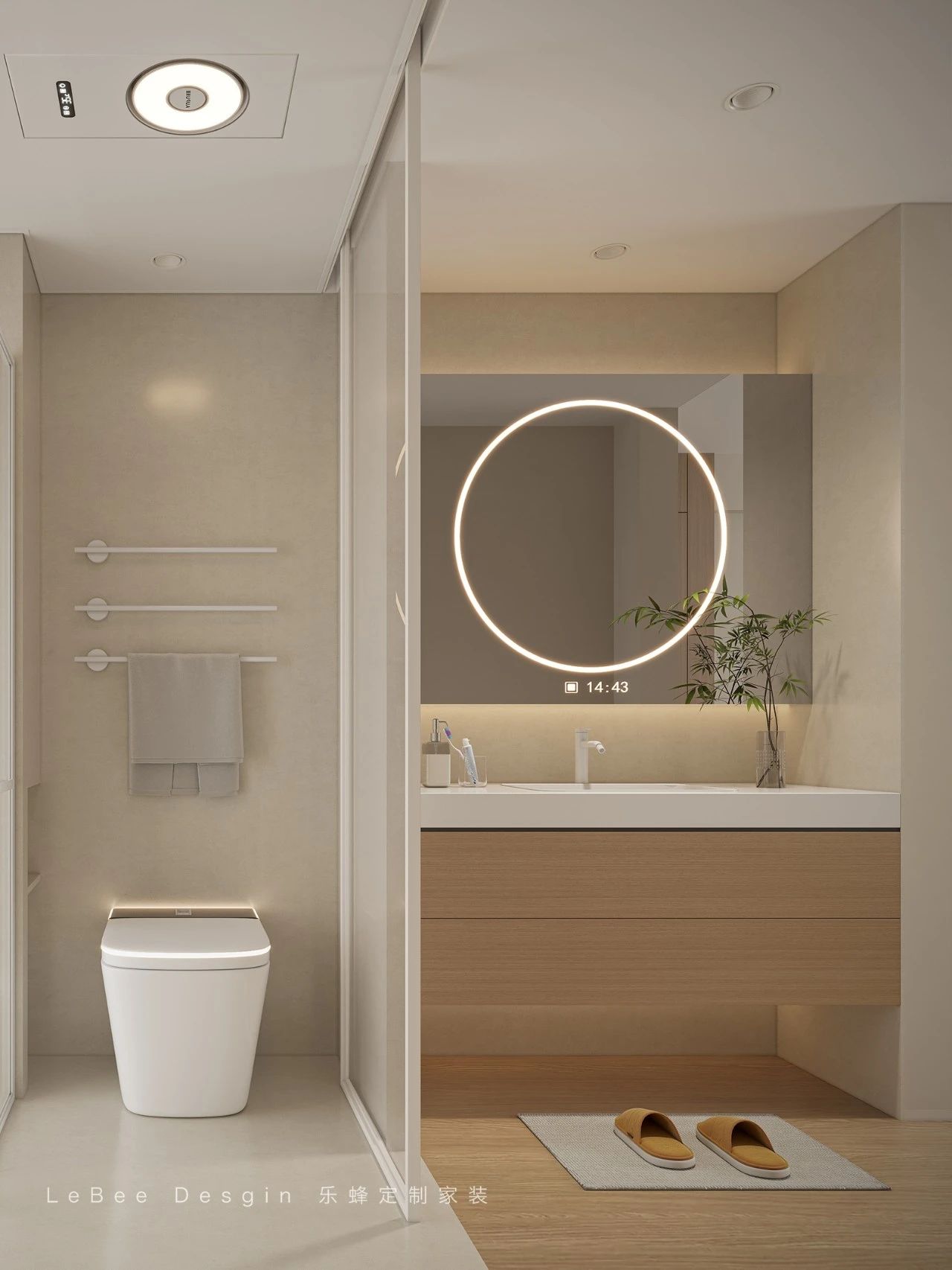 - 衛生間效果圖 - 公衛干區運用奶油配色,帶有原木元素的鏡柜讓人眼前一亮,懸空浴室柜設計精致優雅。