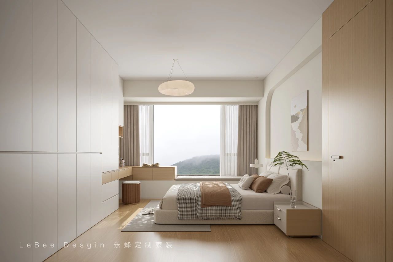 對面定制整排收納柜延伸至飄窗,設計梳妝臺,飄窗放上舒適坐墊,休閑時可欣賞窗外美景。