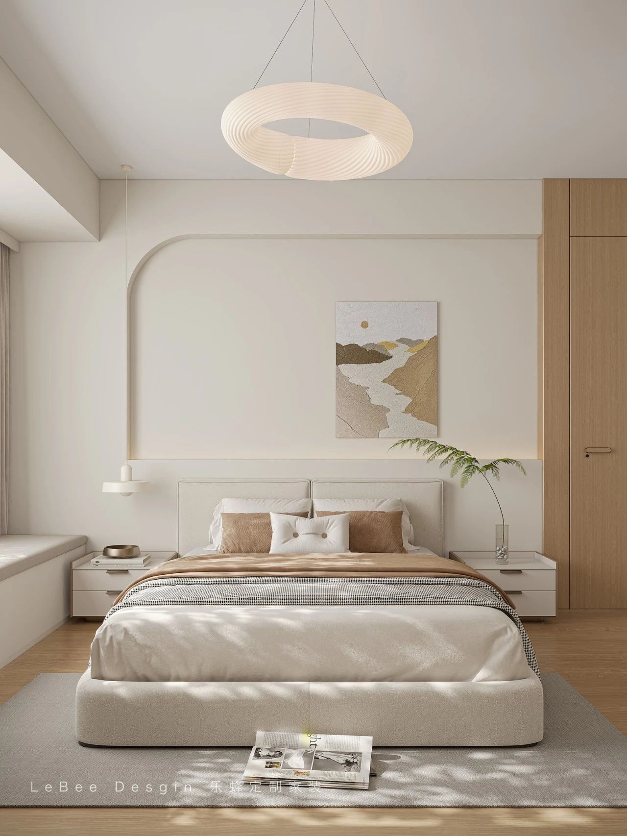 床頭背景墻造型設計弧形過渡融入裝飾畫點綴,配合燈帶營造出溫馨氛圍感。
