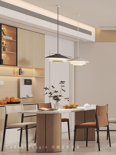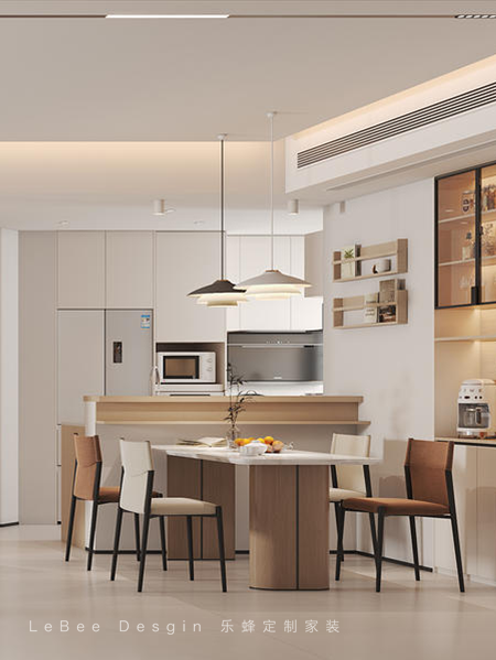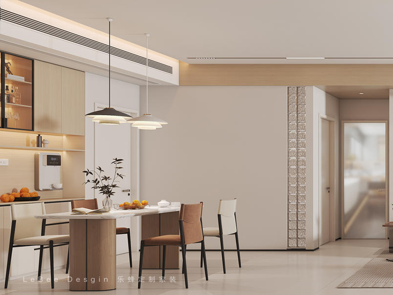- 餐廳效果圖 - 一側延伸出雙人吧臺,可用于辦公、用餐或小酌,增進家人之間的交流,使居家氛圍更加融洽。