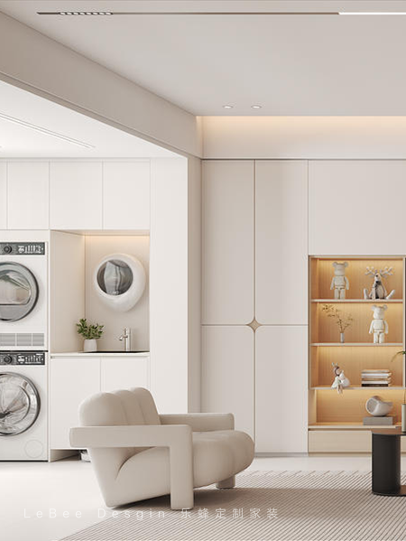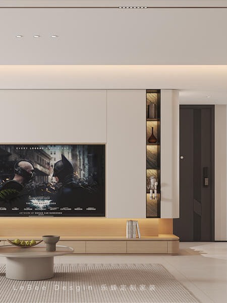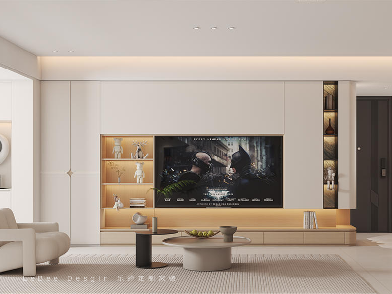 - 滿墻電視柜采用奶油白與原木色的完美融合,散發出溫柔的色調。不僅美觀大方,更具備強大的收納功能。搭配簡約氛圍燈,進一步凸顯原色材質的質感與整體的柔和之美。