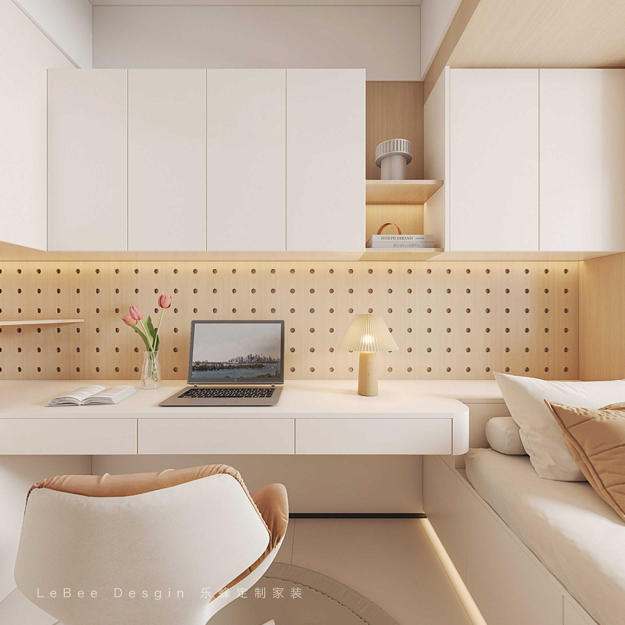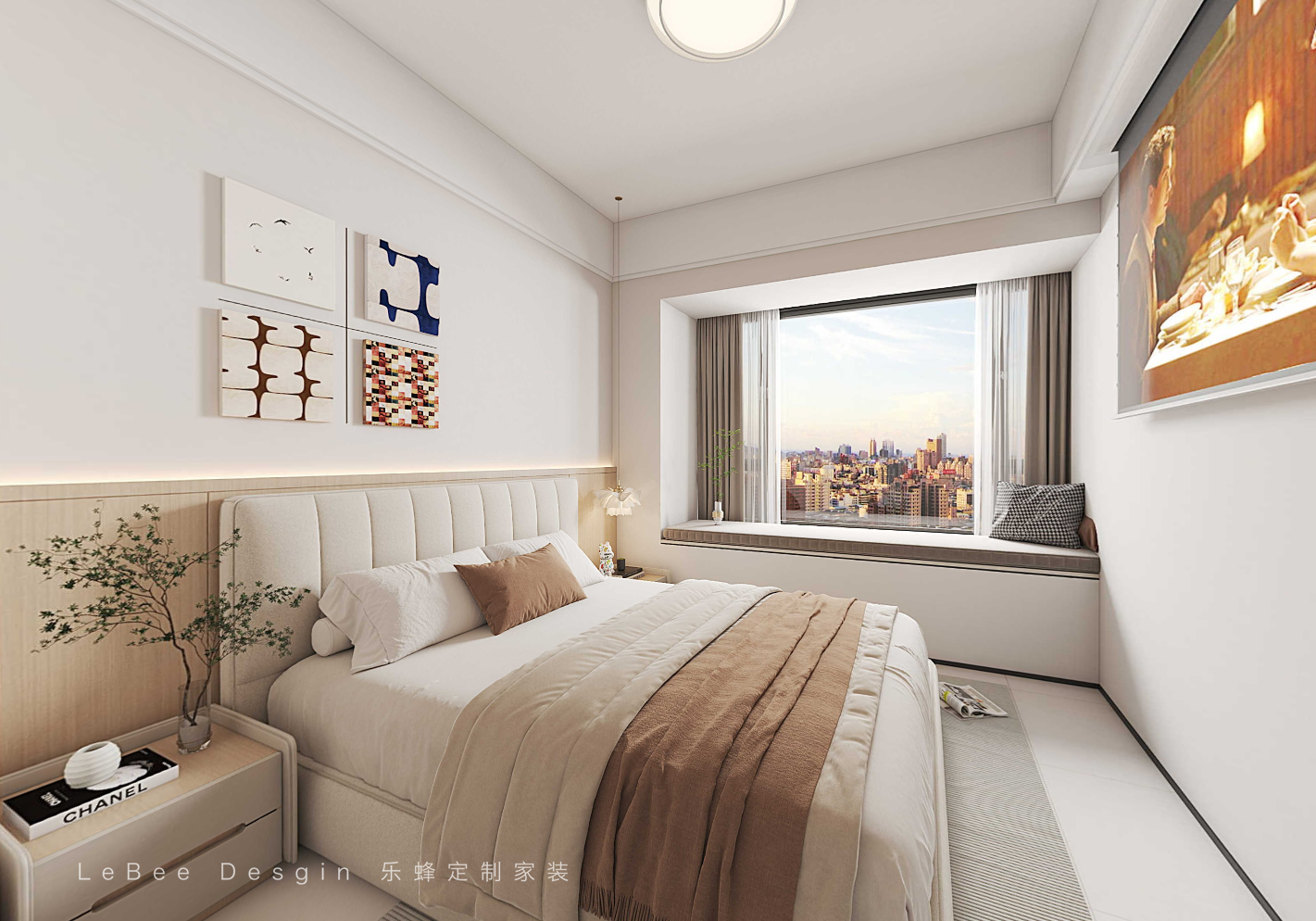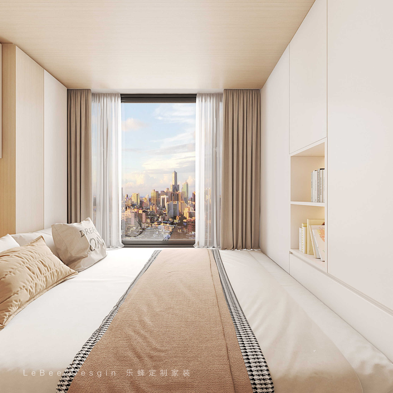 - 次臥效果圖 - 次臥采用整體的色調,定制榻榻米,大大增加了整體的收納空間,使整個空間更加溫馨舒適。
